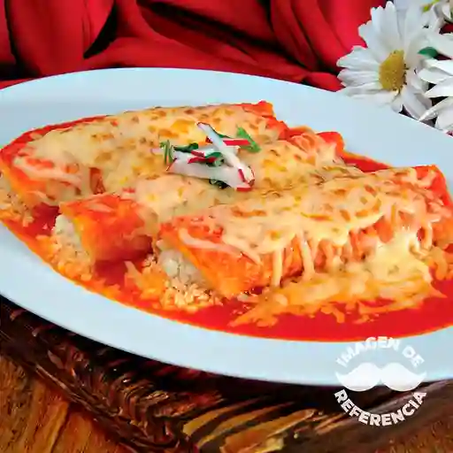 4 piezas de enchiladas en tu salsa favorita, rellenas de queso o pollo, crema y queso gratinado acompañadas de frijolitos