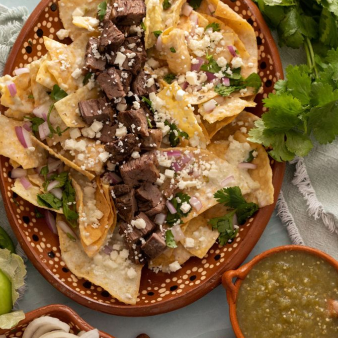 Deliciosos chilaquiles en salsa ranchera tatemada coronados con bistec sobre los chilaquiles, crema, queso y cebolla encurtida acompañados de huevito y frijolitos