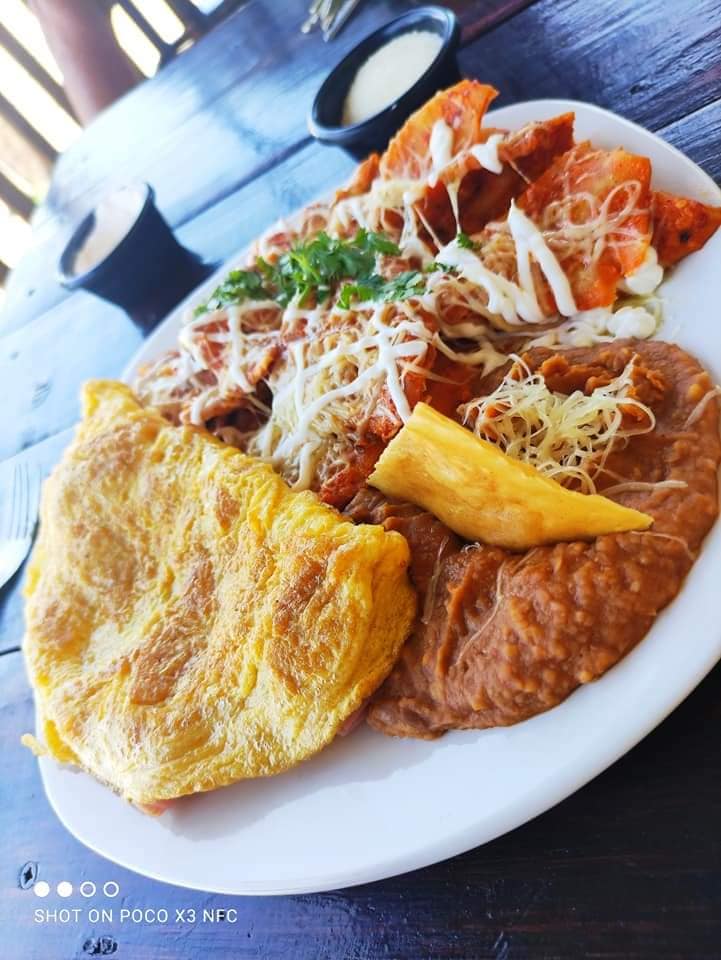 Chilaquiles con crema y queso en cualquiera de nuestras salsas, acompañados de bisteck a la mexicana en salsa de tomate receta de la casa, huevo al gusto y frijoles refritos