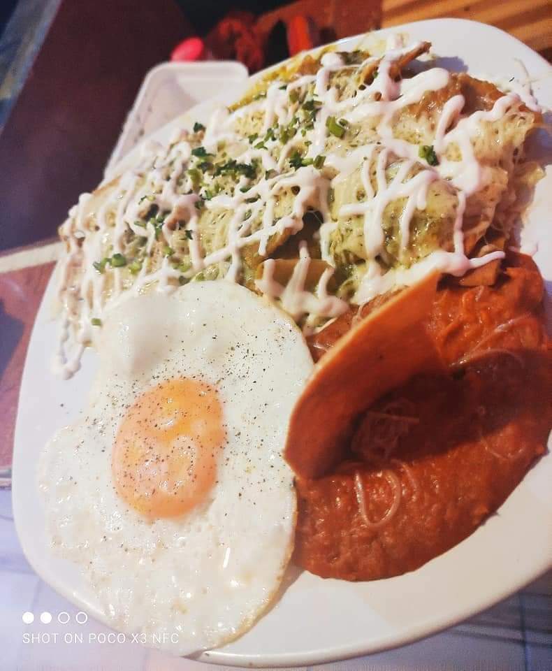 Chilaquiles mitad salsa verde mitad salsa roja con huevo estrellado sobre los chilaquiles, servido con guiso y frijoles