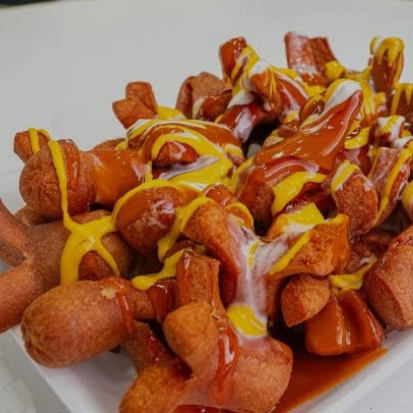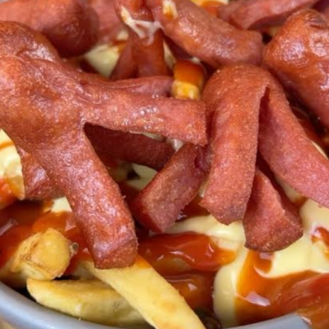 papas fritas acompañados de 6 salchipulpos bañados en queso y salsa catsup