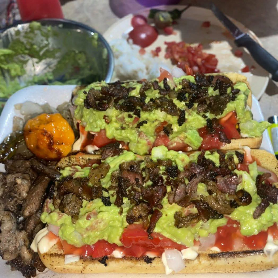 150gr arrachera, jamón, queso, 1 salchicha asada, lechuga, cebolla, tomate, aguacate y aderezos
