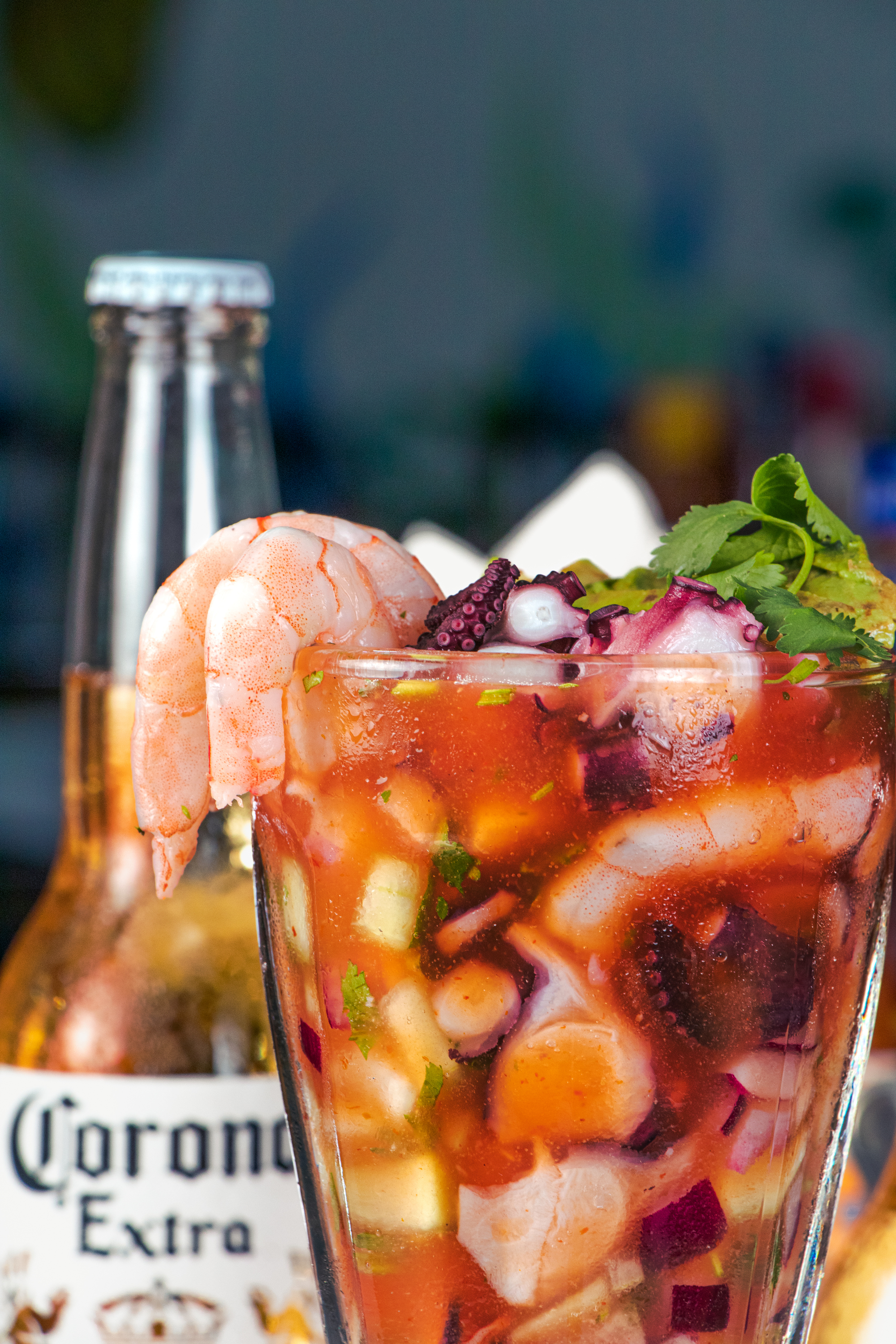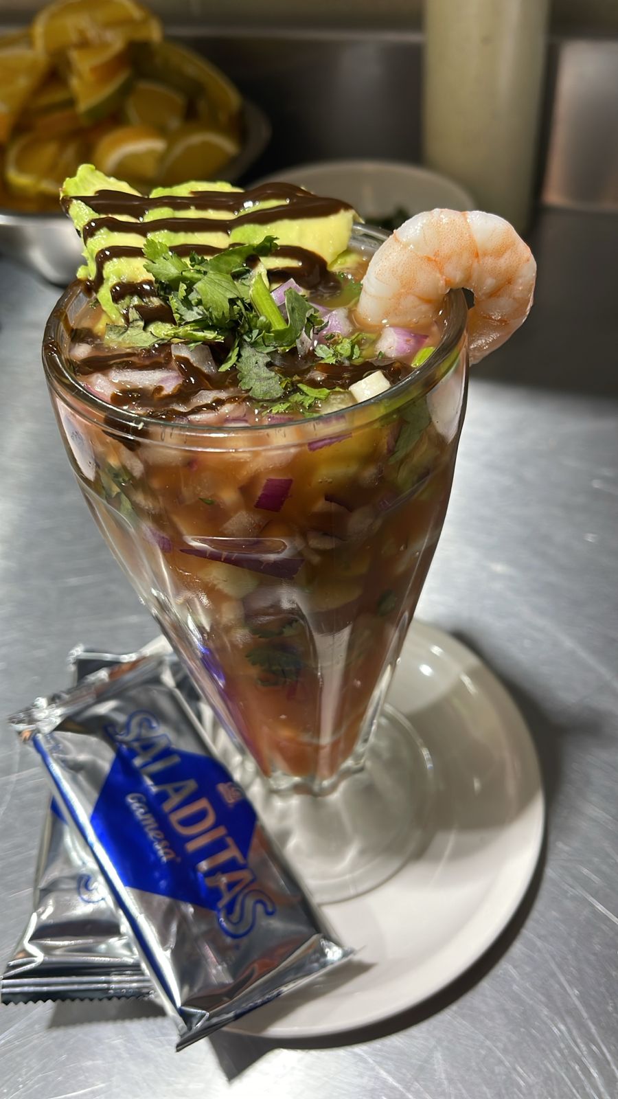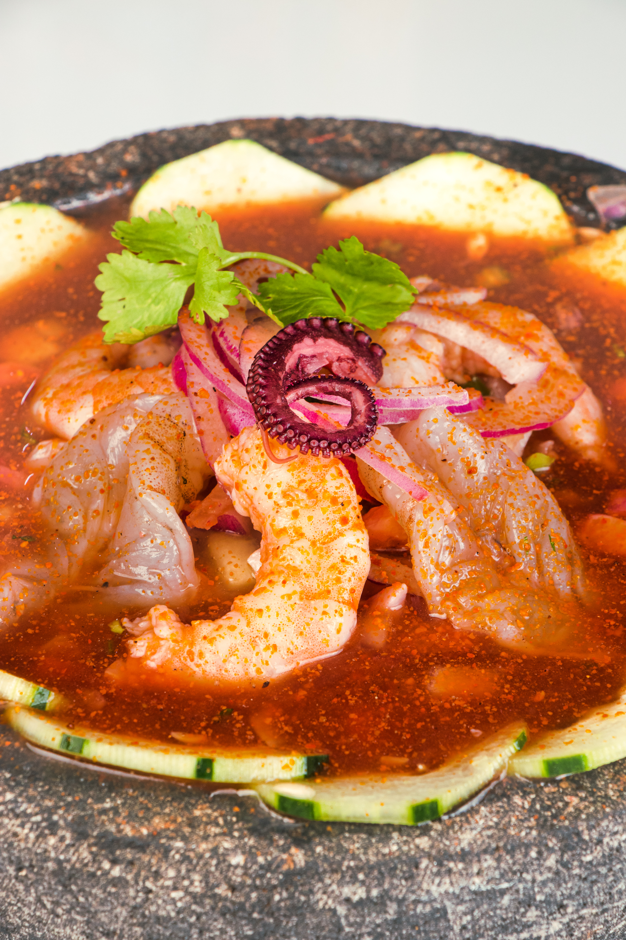 6 Camarones crudos, pulpo, calamar, trocitos de pepino, salsa, cebolla y salsas negras. Cilantro, jugo de limón, tiritas de aguacate y salsas negras.