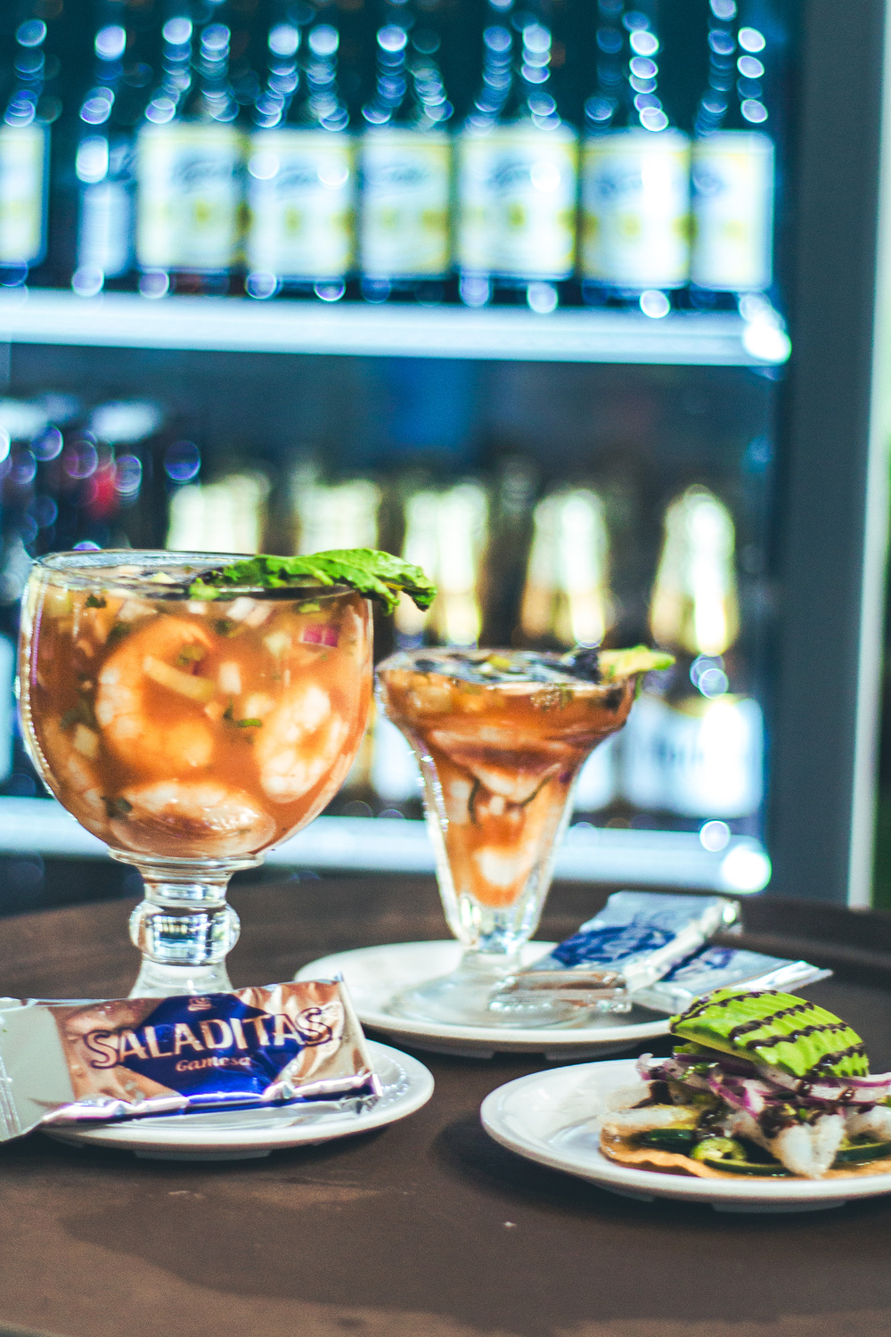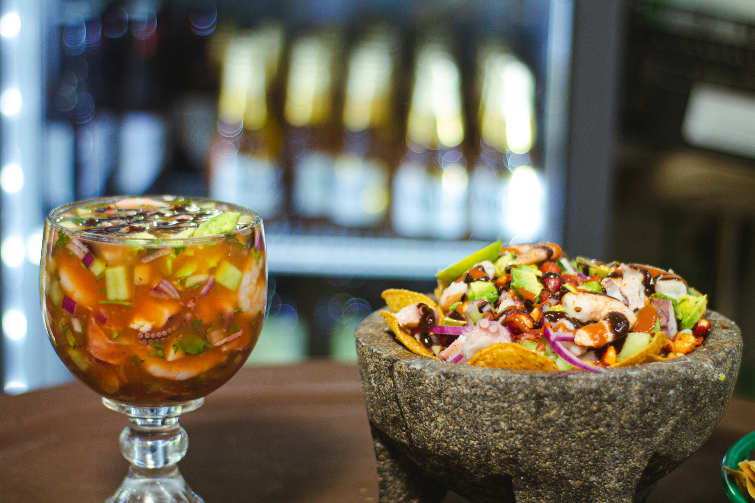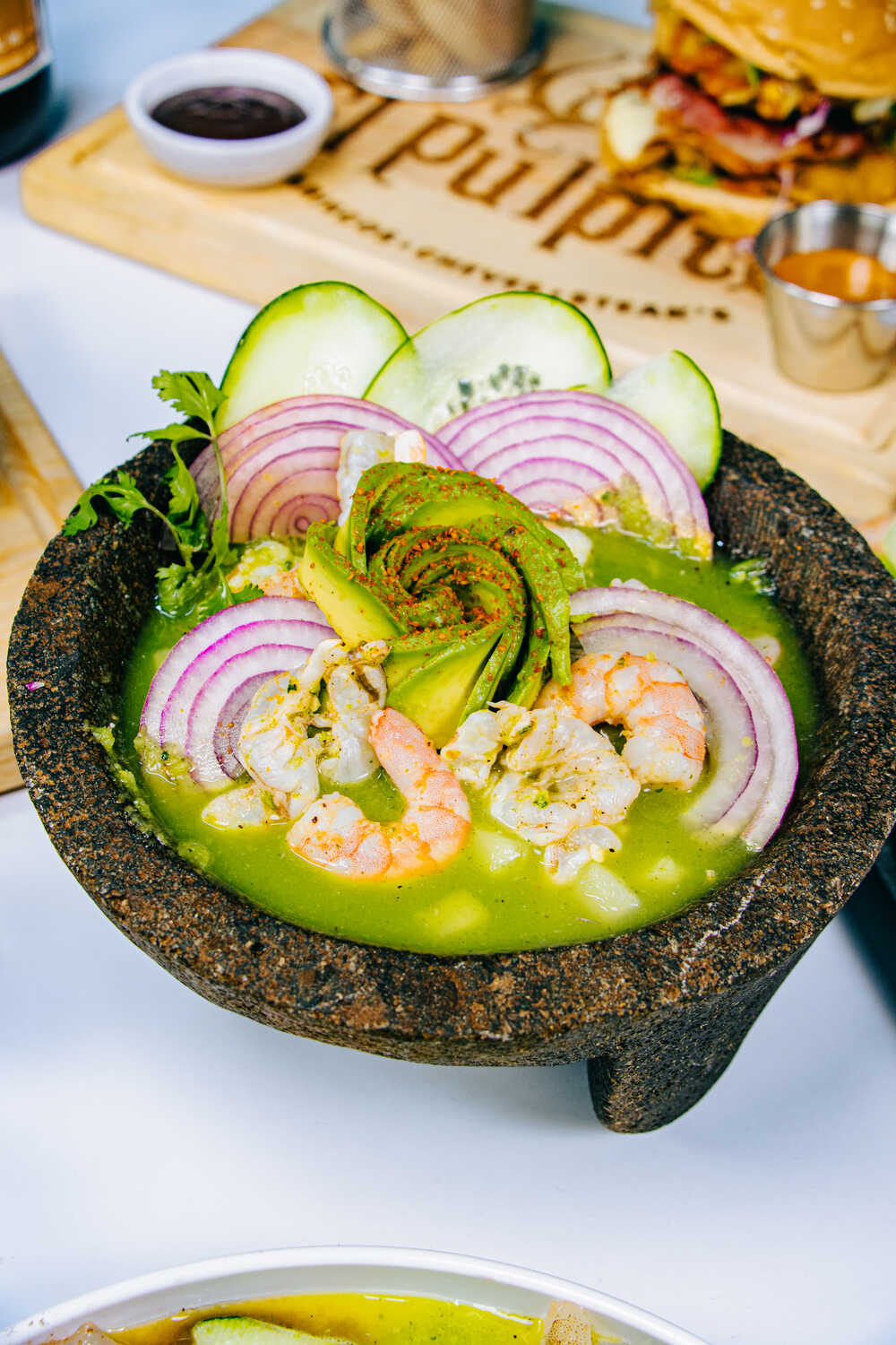 6 Camarones crudos, pulpo, calamar, trocitos de pepino, salsa, cebolla y salsas negras. Cilantro, jugo de limón, tiritas de aguacate y salsas negras.