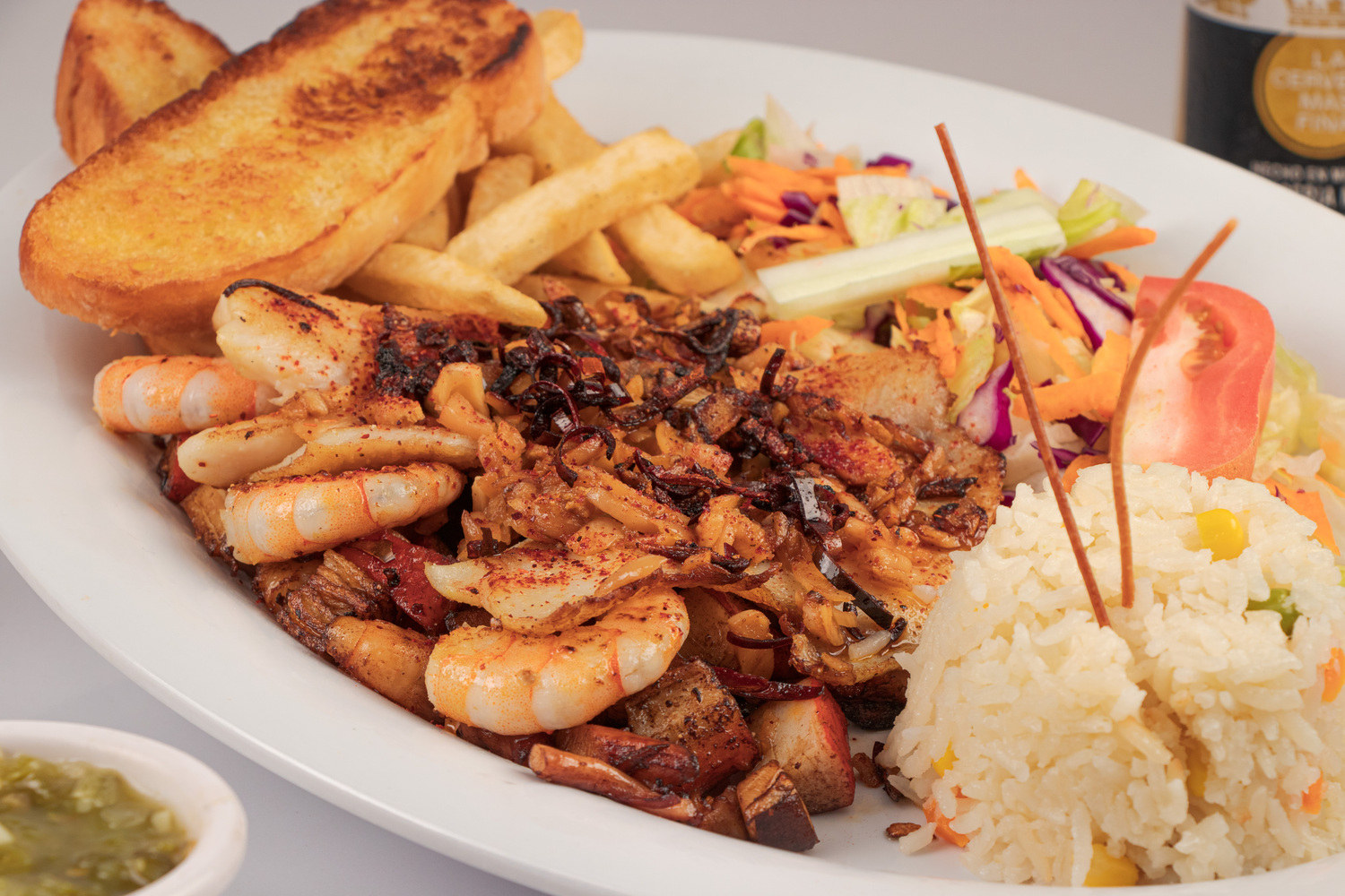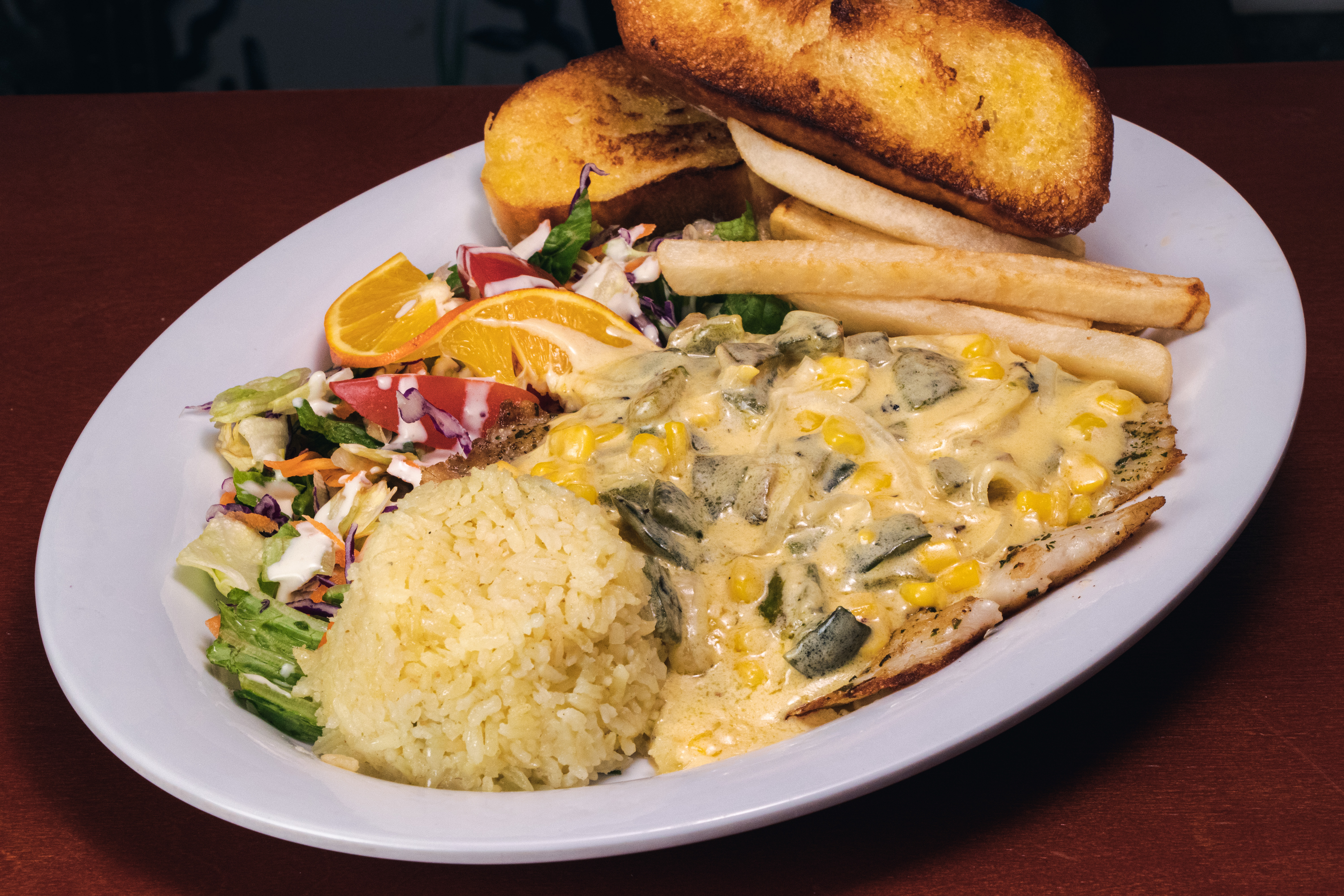 Filete de pescado sazonado a la plancha, bañado en salsa picante de la casa. Acompañado de arroz, ensalada y papas a la francesa.