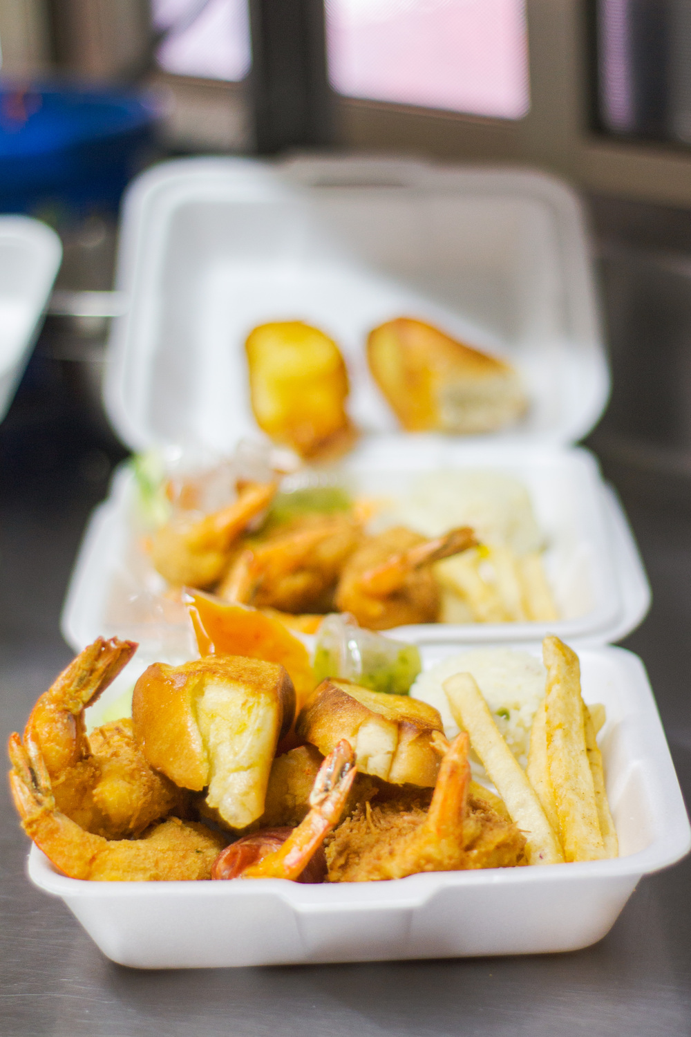 Camarones mariposa empanizados con ralladura de coco, acompañados con arroz, ensalada y papas.