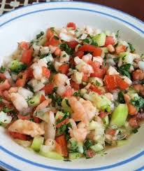 Camarón cocido en trozo, cebolla, tomate, cilantro, pepino y limón.