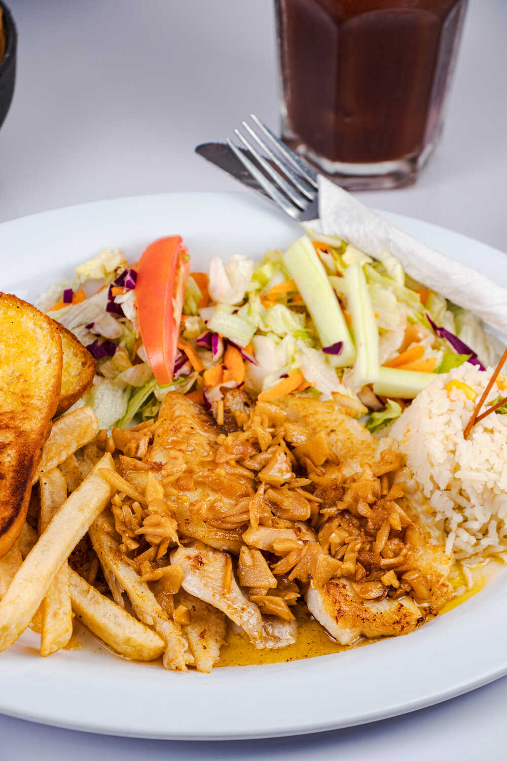 Filete a la plancha sazonado con mantequilla y trocitos de ajo. Acompañado de arroz ensalada y papas a la francesa.