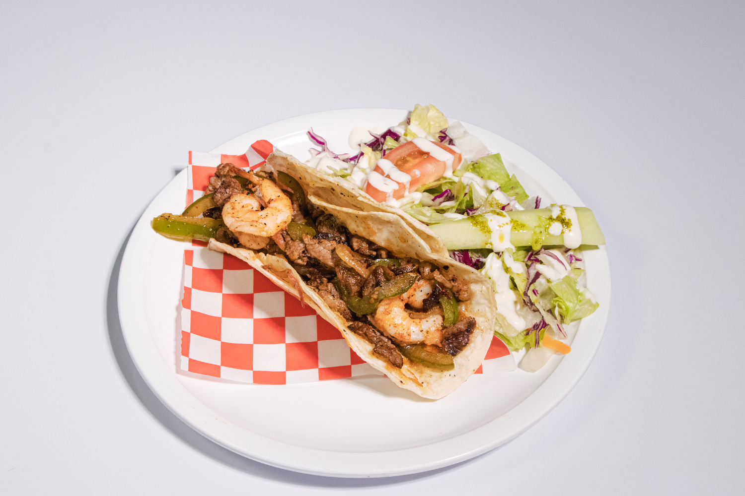 1 Tortilla acompañada de chileca, rellena de trozos de camarón con aderezo de chipotle.