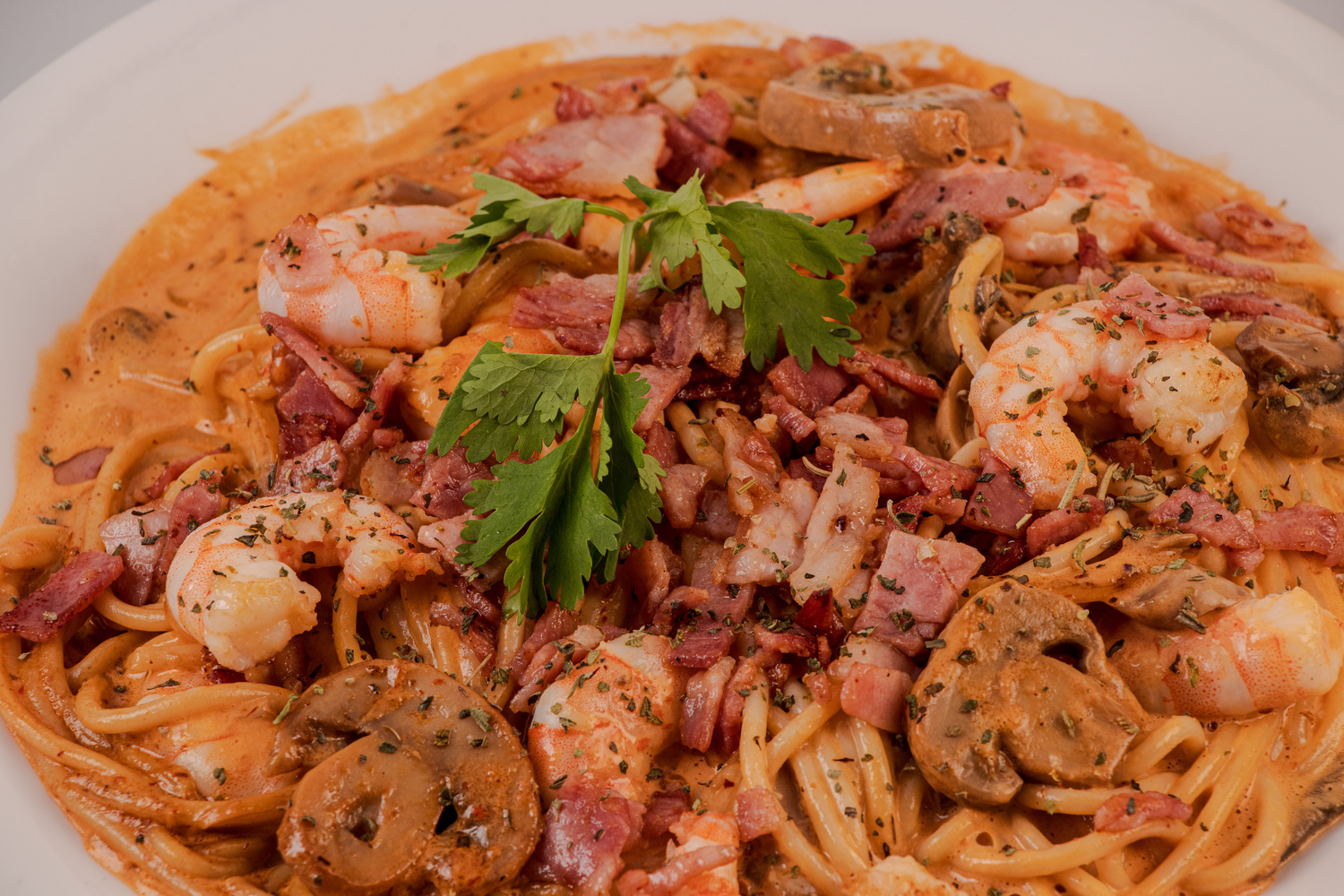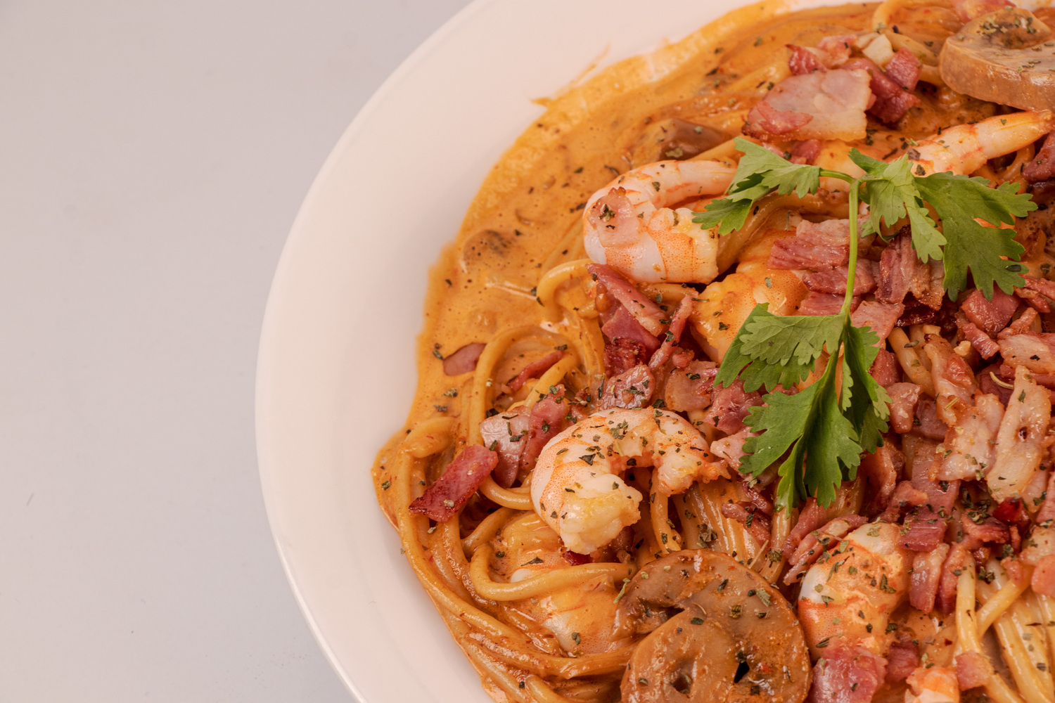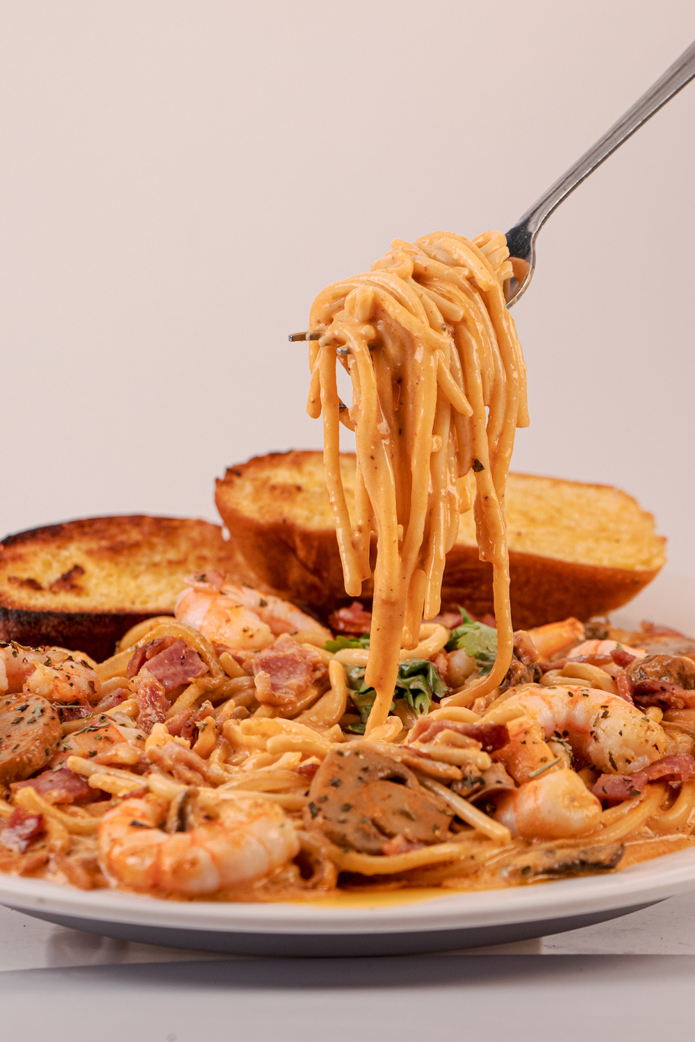 1 Porción de espagueti, crema, tocino, queso, camarones cocidos y 3 pzas de pan con mantequilla.