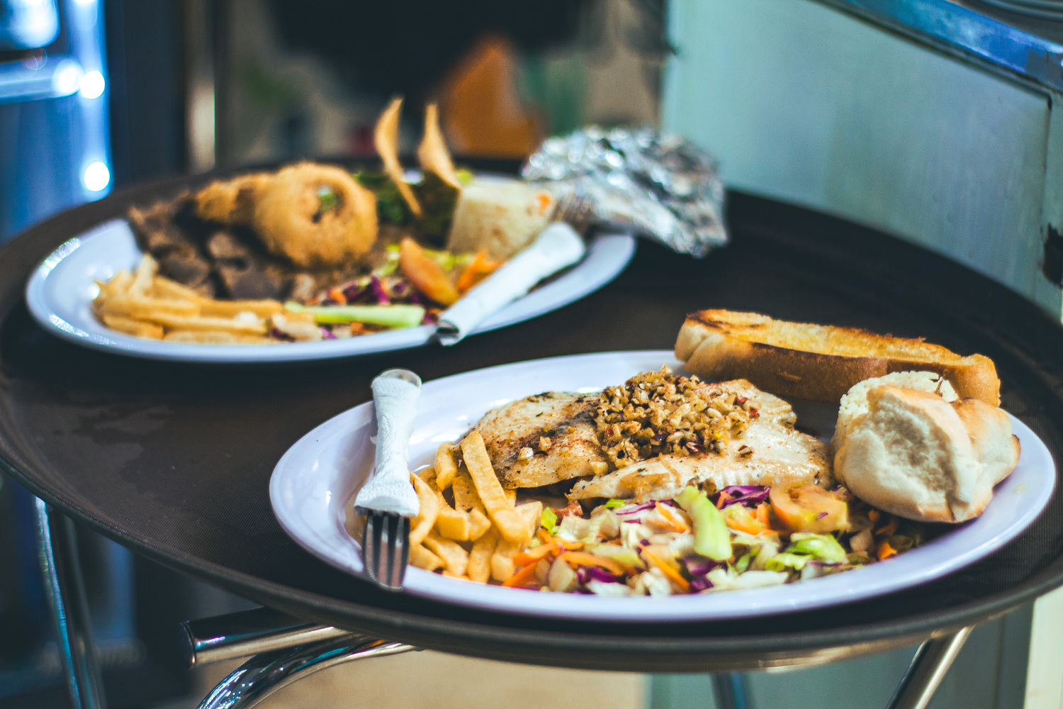 Filete en aluminio, pimienta, cebolla, zanahoria y verduras al vapor.