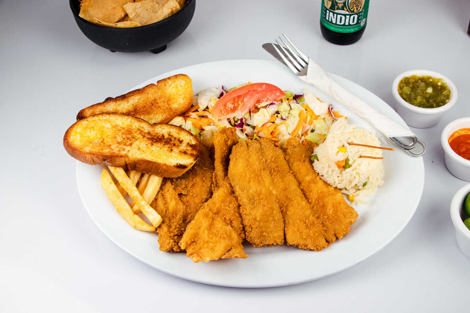 Filete a la plancha sazonada, guisada con chile, tomate y cebolla. Acompañado de arroz, ensalada y papas a la francesa.