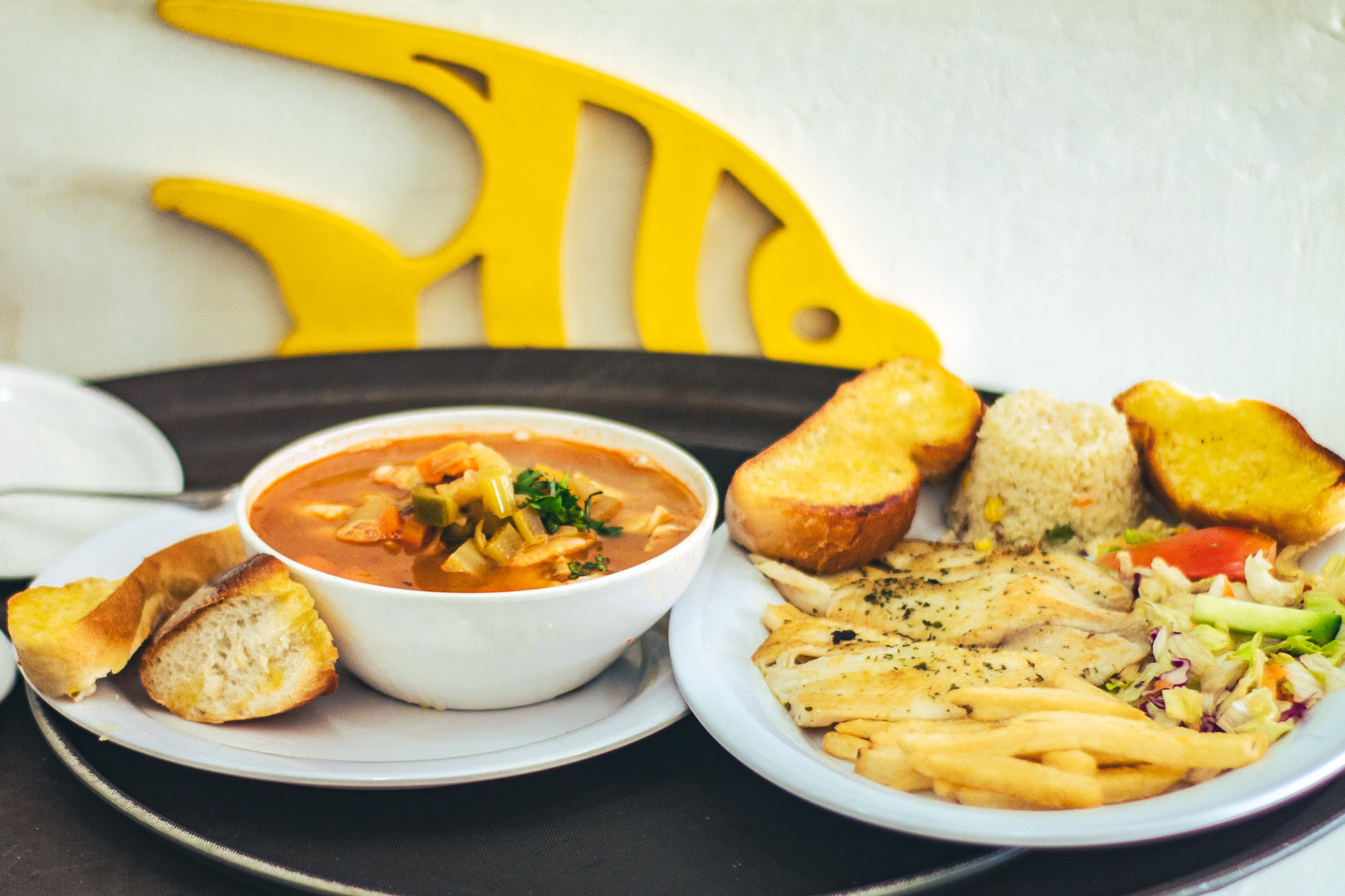 Zanahoria, chayote, repollo, trozos de pescado y cilantro. Acompañado de 2 pzas de pan con mantequilla.