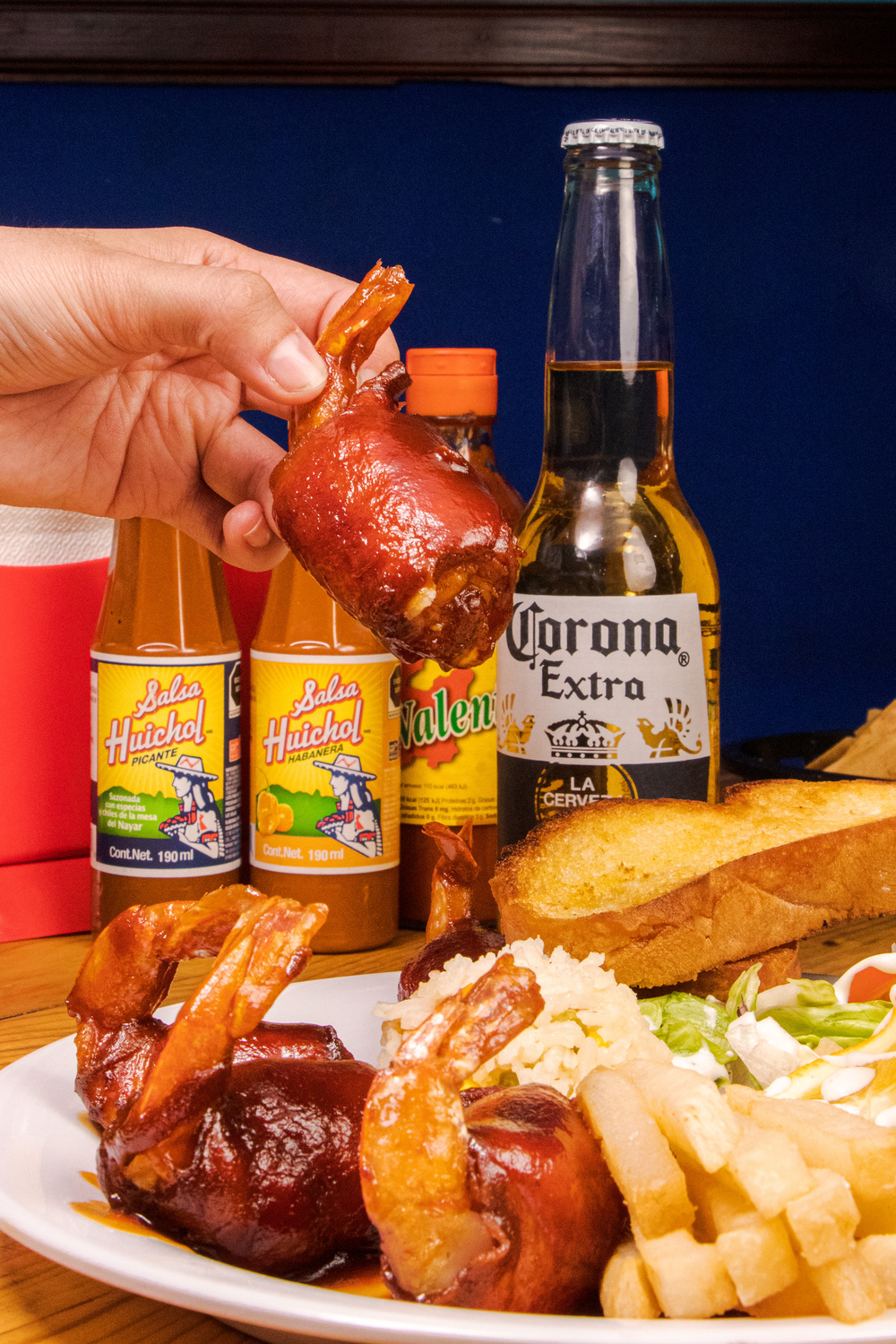 Camarones rellenos de queso chihuahua envueltas con tocino, acompañados con arroz, ensalada y papas.
