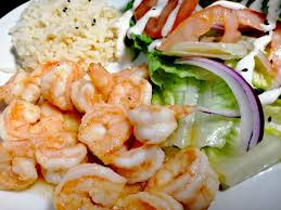 Camarones guisados con mantequilla, trocitos de ajo y chile. Acompañados con arroz, ensalada y papas.