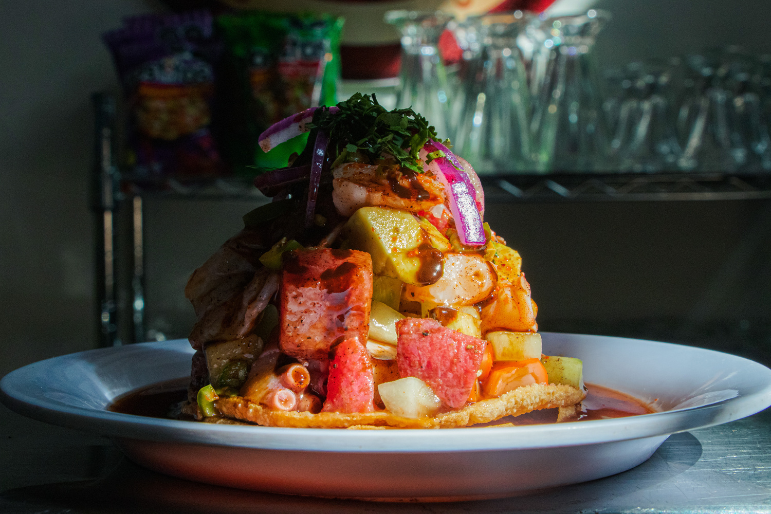 Cama de aguacate, atún cocido, pulpo, 2 camarones cocidos, cebolla, sal, pimienta y salsa negra.