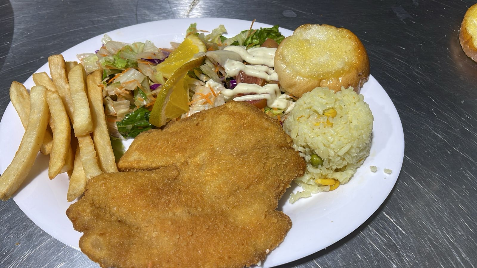 Filete empanizado, acompañado de arroz ensalada y papas a la francesa.