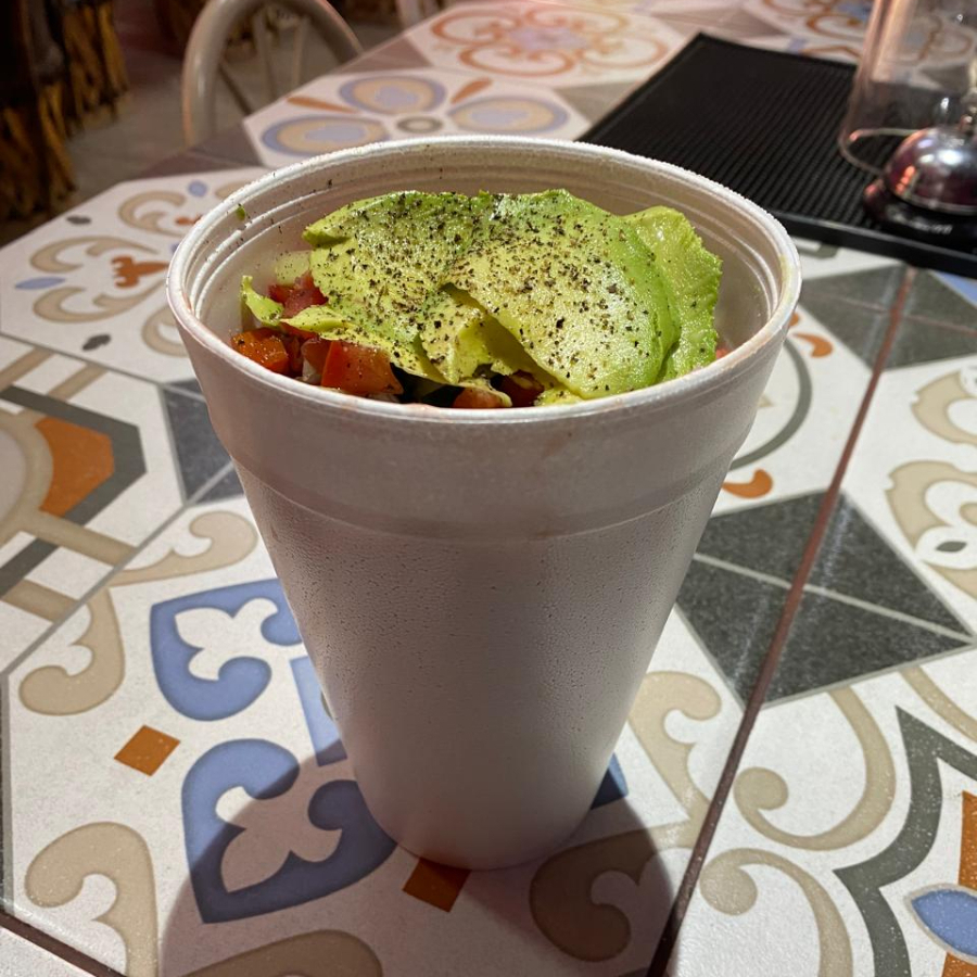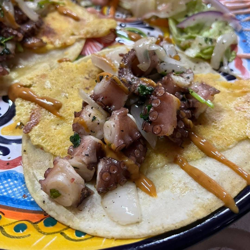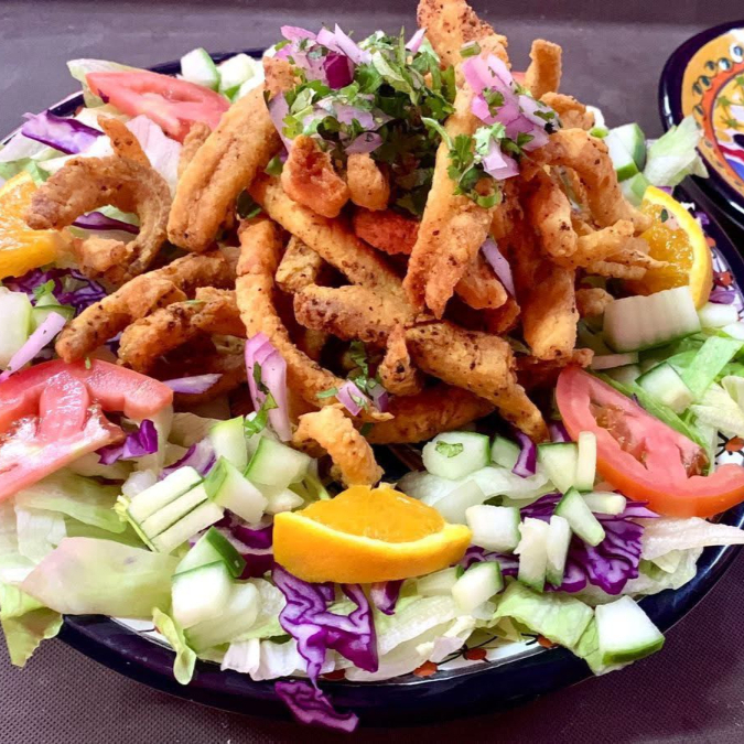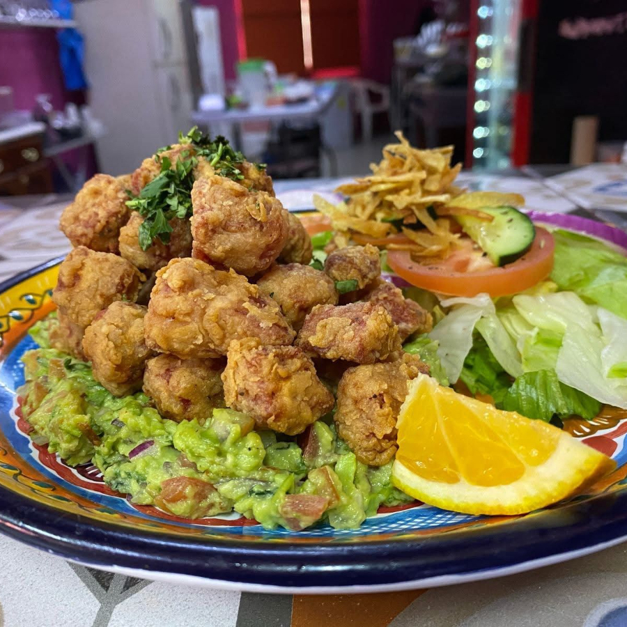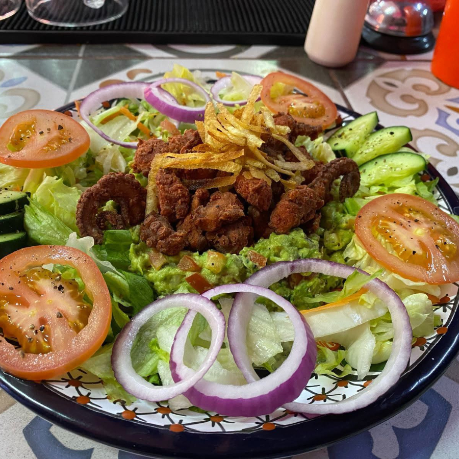 400 gramos de chicharrón de pulpo, acompañado de una cama de aguacate, ensalada, tortillas y salsas