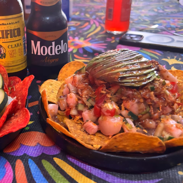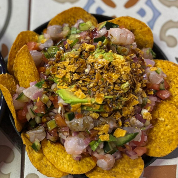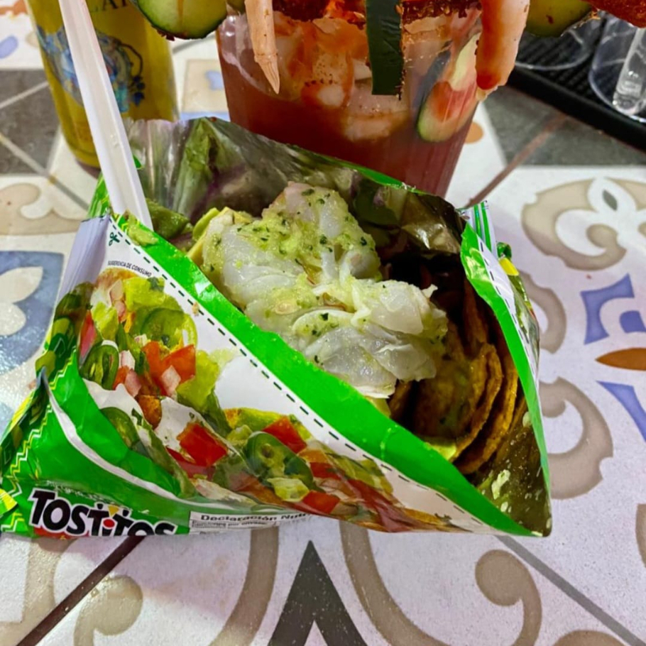 Tostitos Acompañados de Aguachiles Norteños con salsa negra a base de chile chiltepin