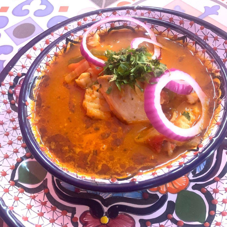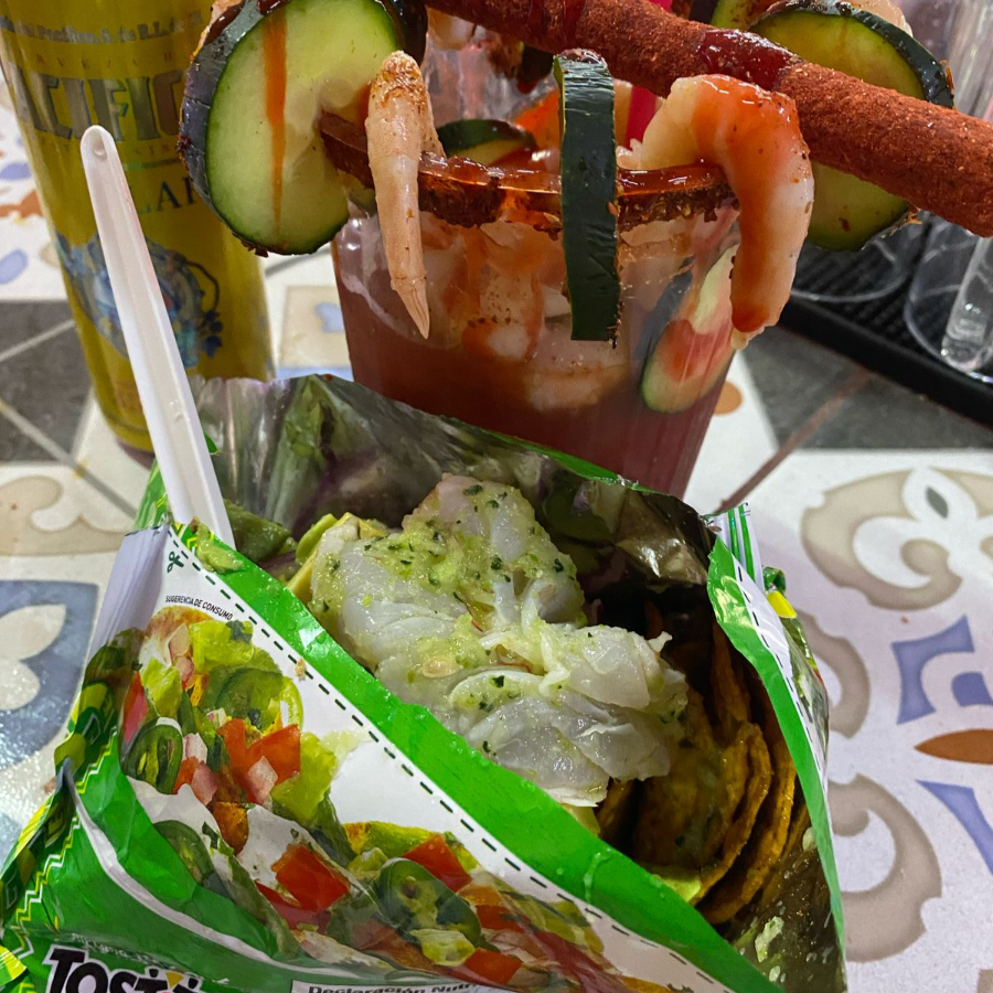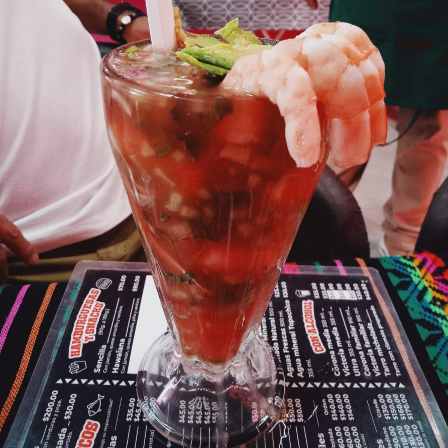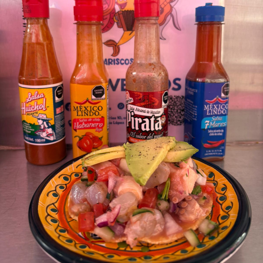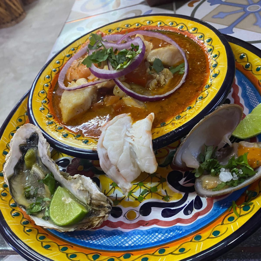 Acompañado de pescado, pulpo, camaron, callo de almeja, ostion y almejas chocolatas