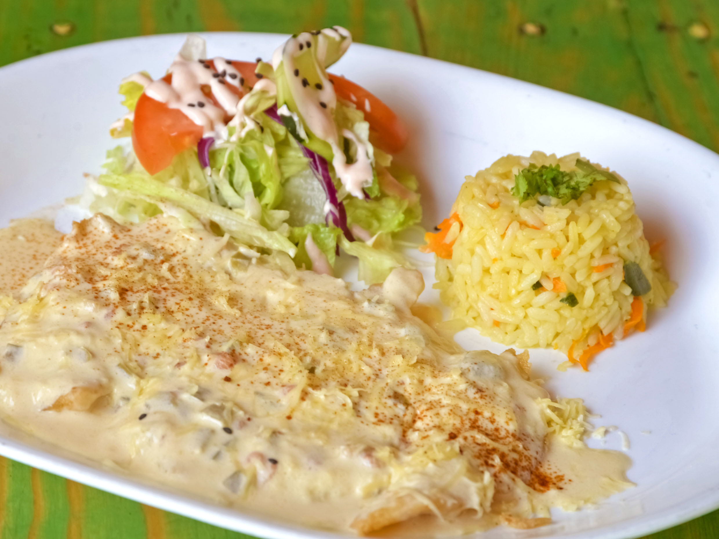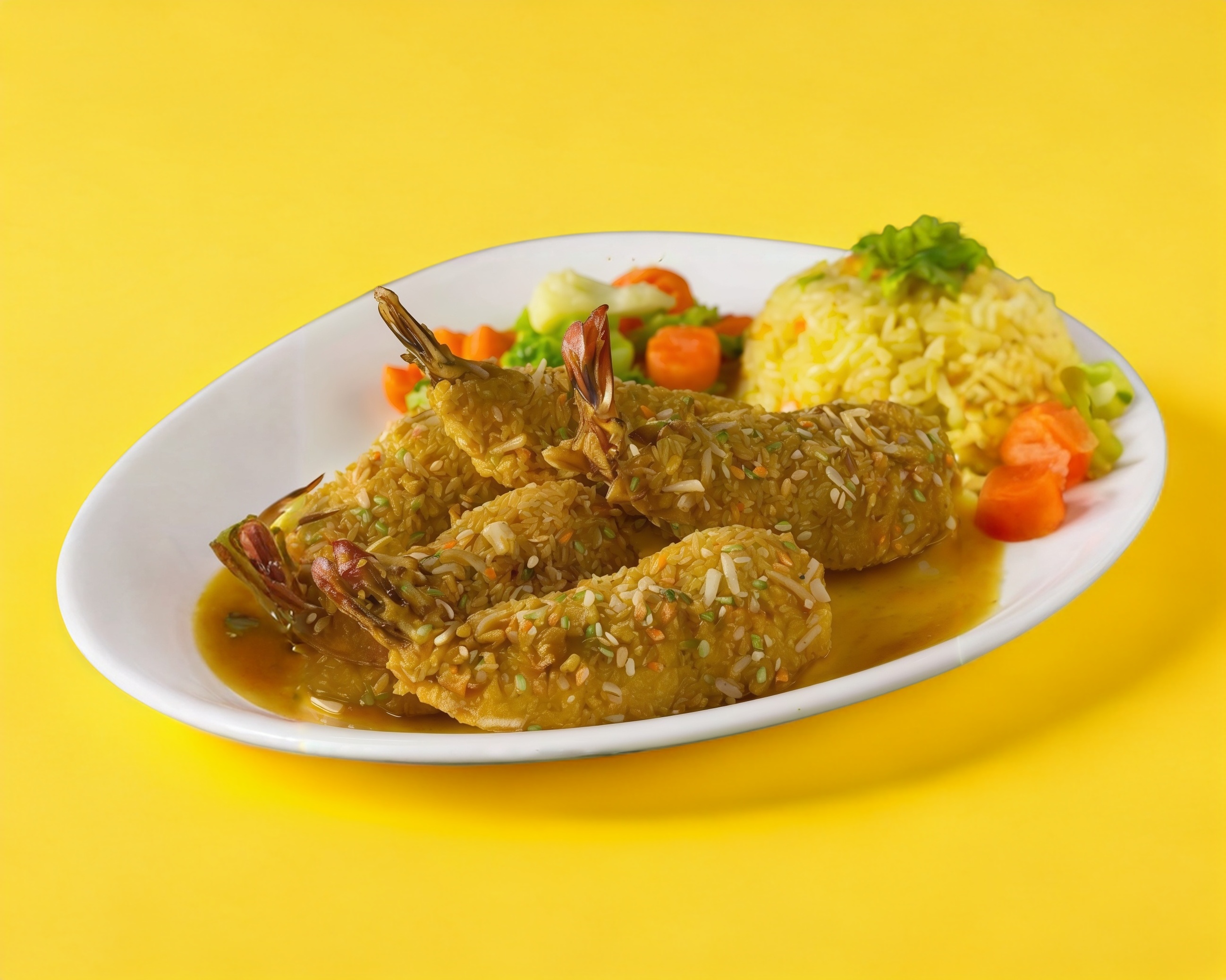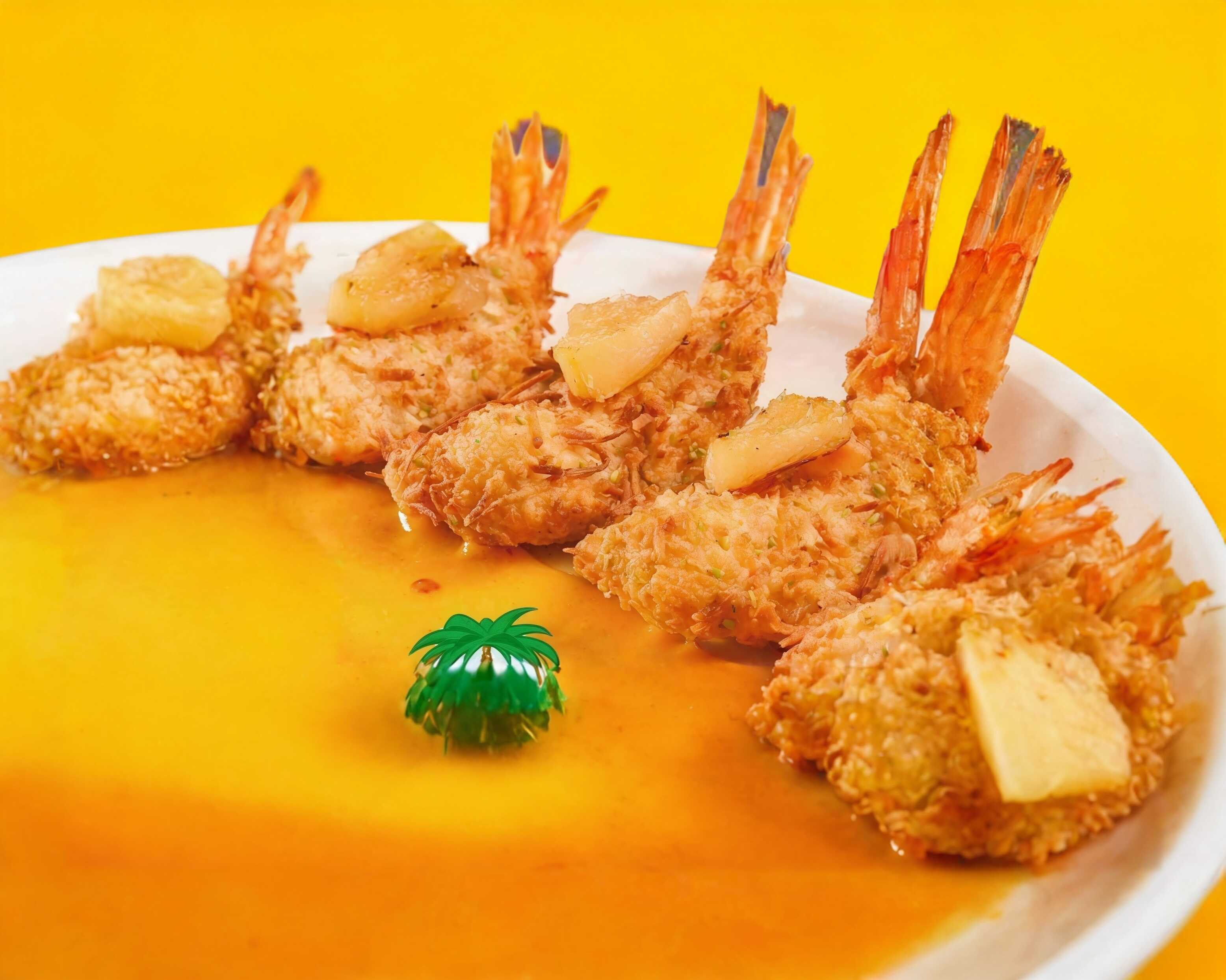 Camarones empanizados con coco y ajonjolí, rellenos de queso crema, montados en salsa de mango.