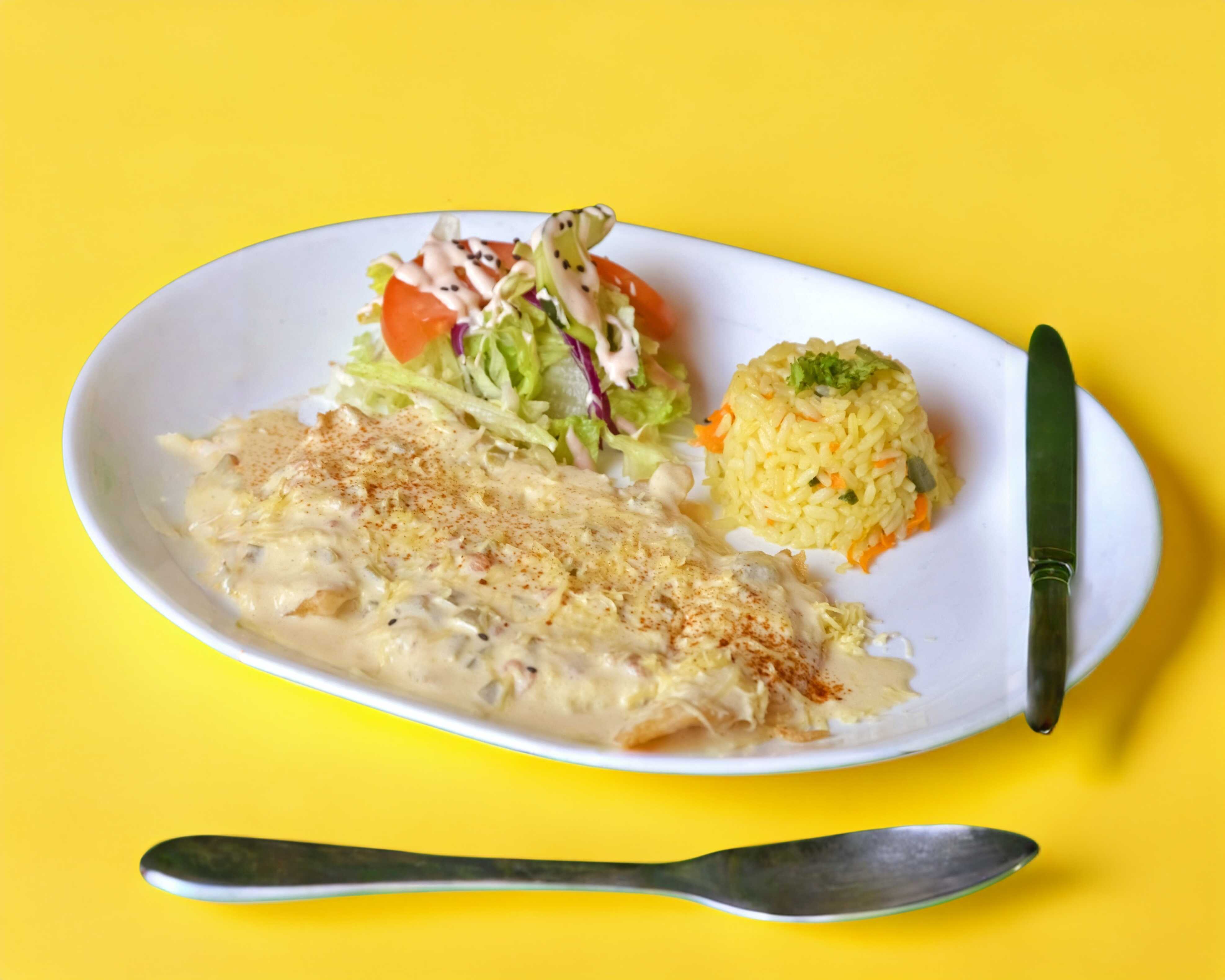 Filete de pescado relleno de camarones y verdura cocido al vapor.