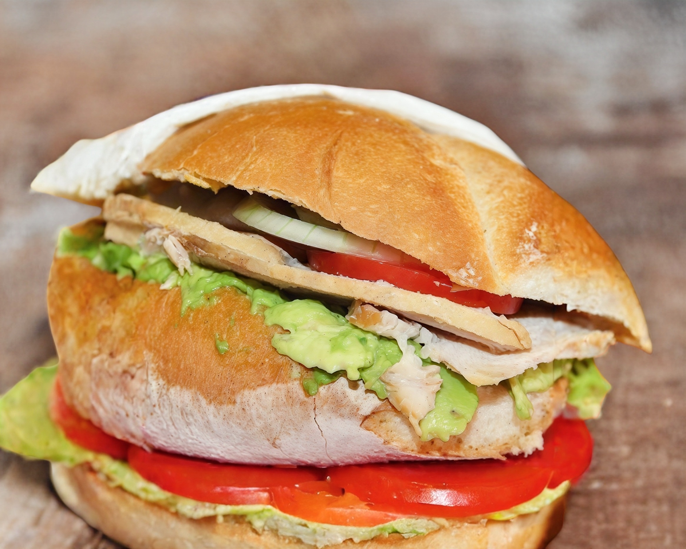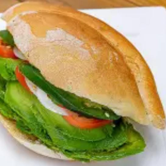 Fresco pan lagunero con aguacate, cebolla, tomate, chiles curtidos, mayonesa y mostaza.