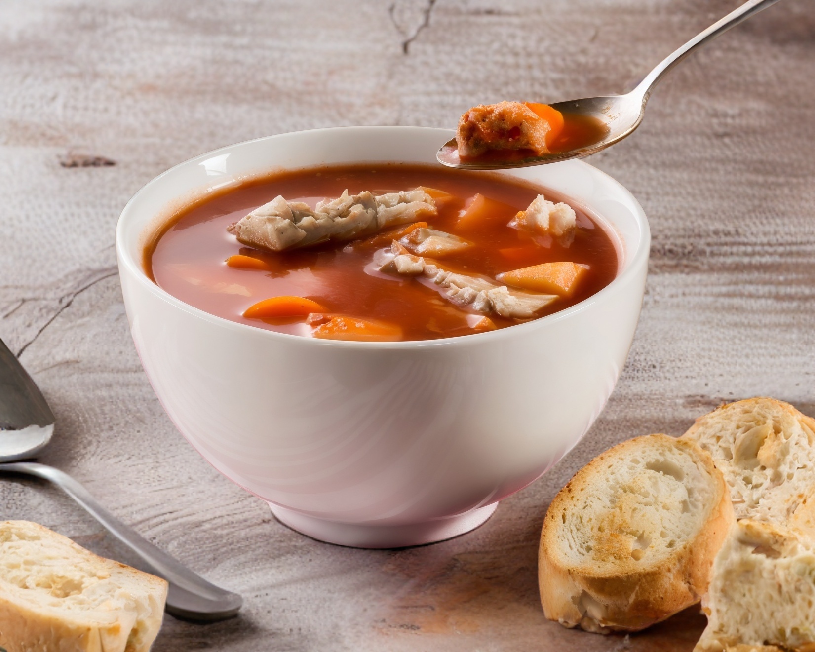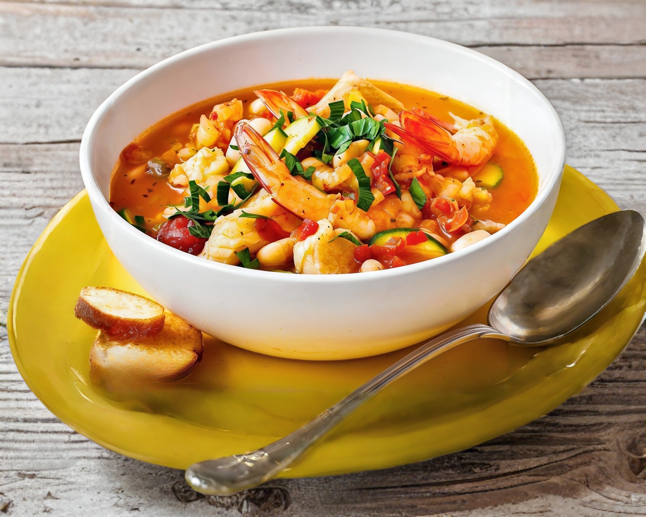 Caldo de camarones, pulpo y pescado con delicioso apio, cebolla, zanahoria, papa y especies.