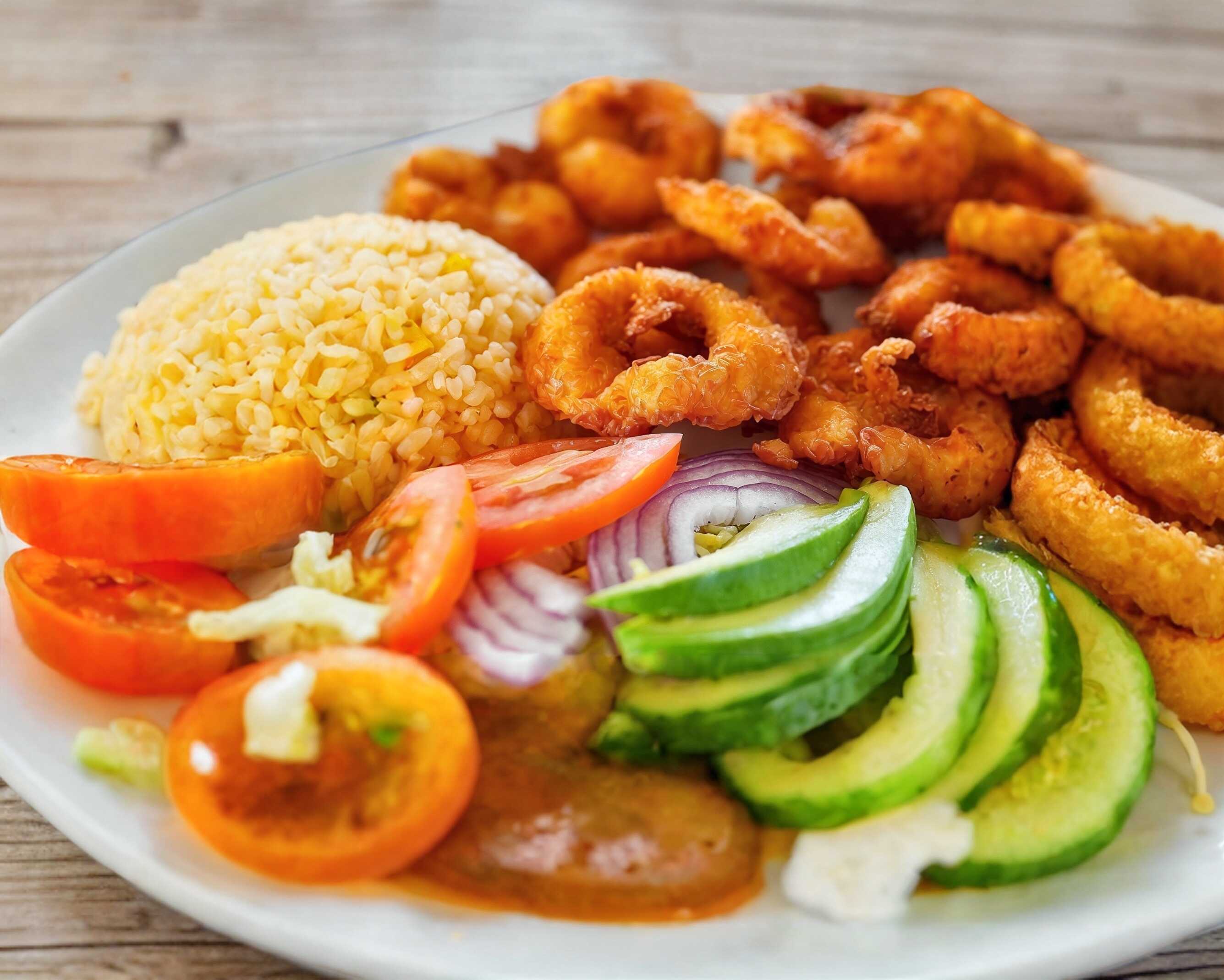 6 Camarones empanizados, acompañado arroz, ensalada, pan con mantequilla y salsa.