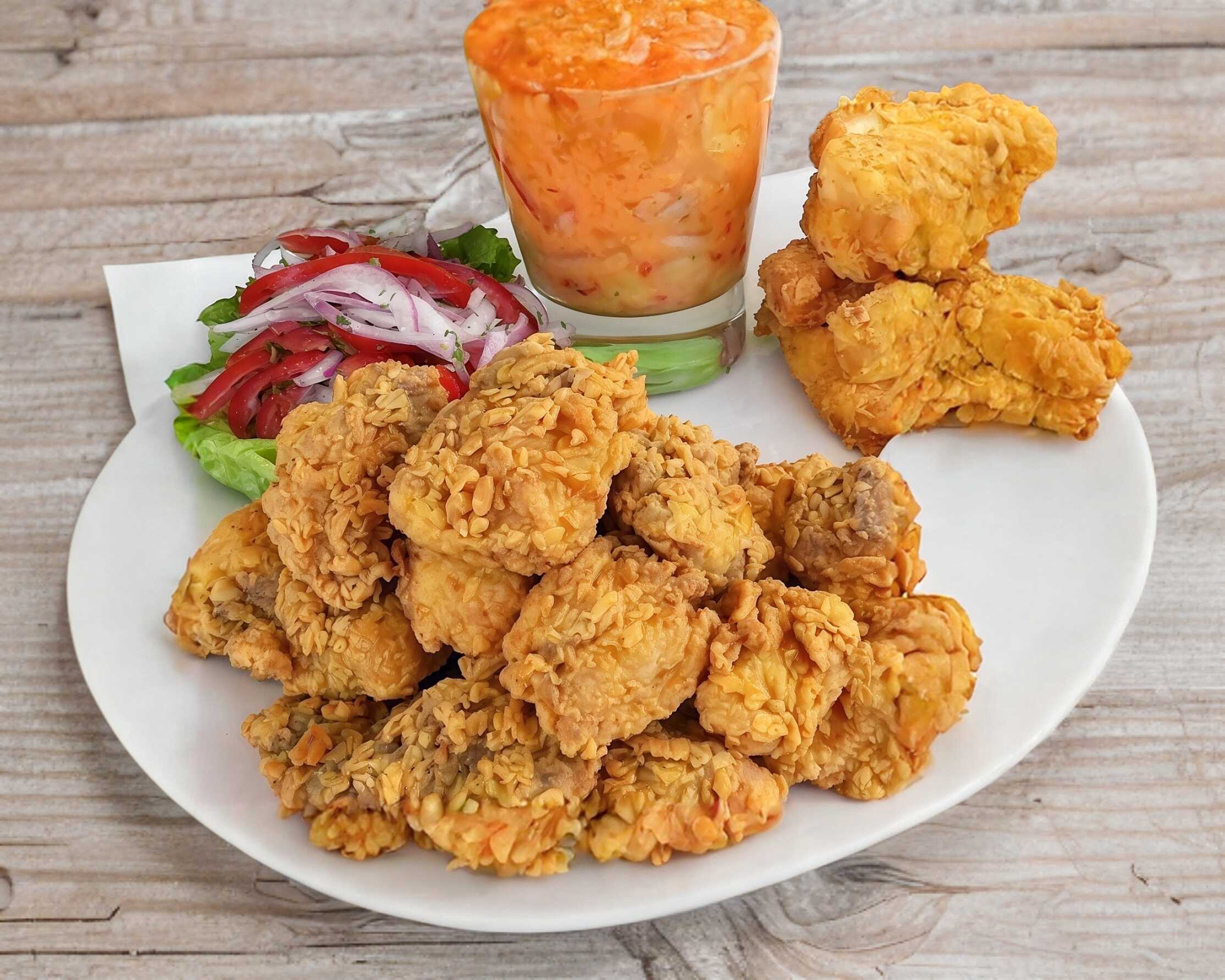 1/2 Chicharrón de pescado acompañado de salsa, tortillas y guacamole.