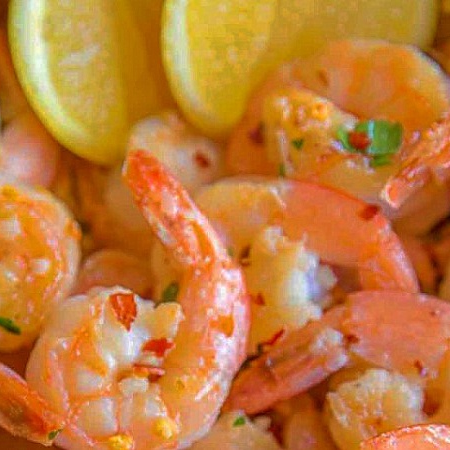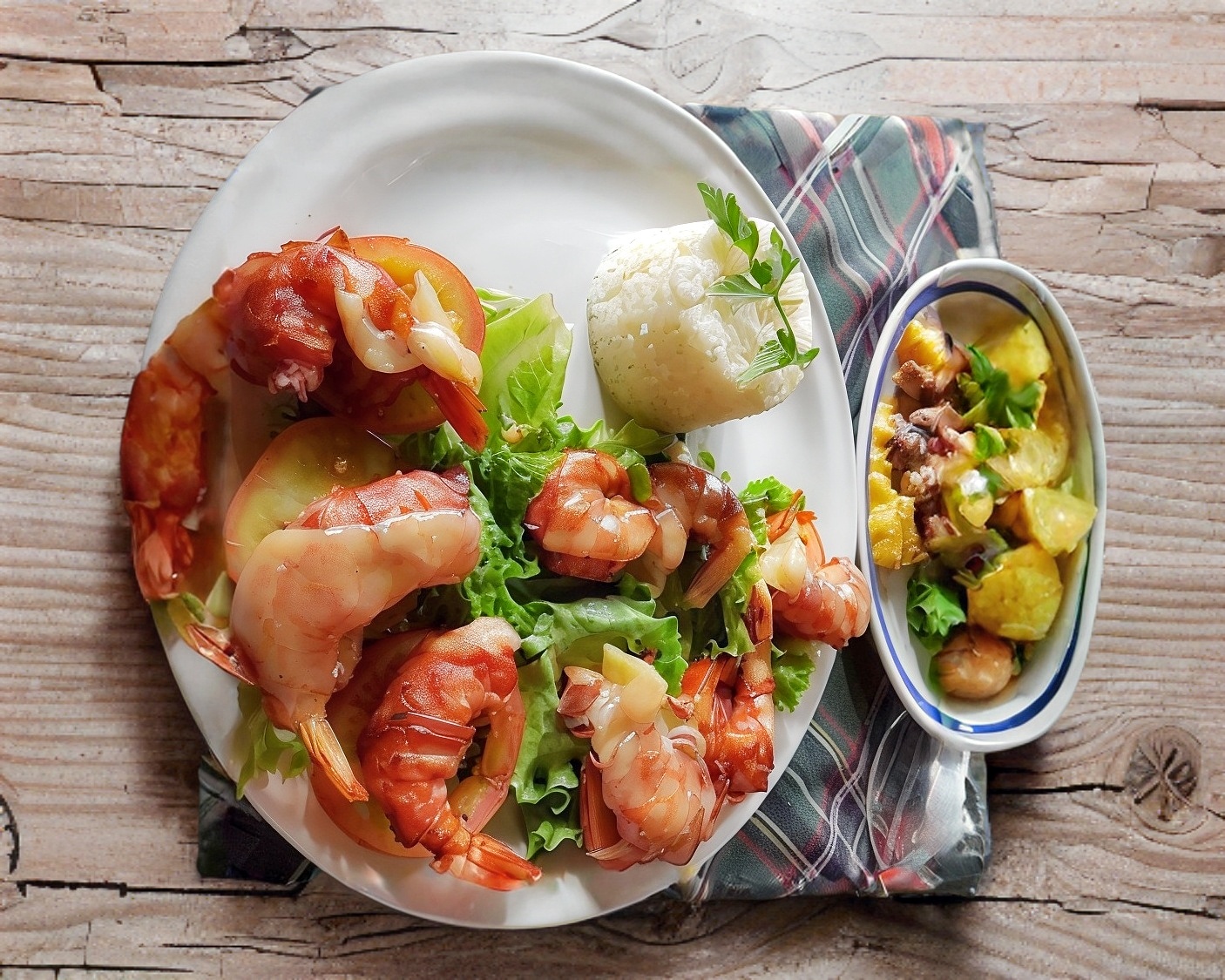 6 Camarones guisados con ajo, aceite de oliva. Acompañado de morrón, ensalada, pan.