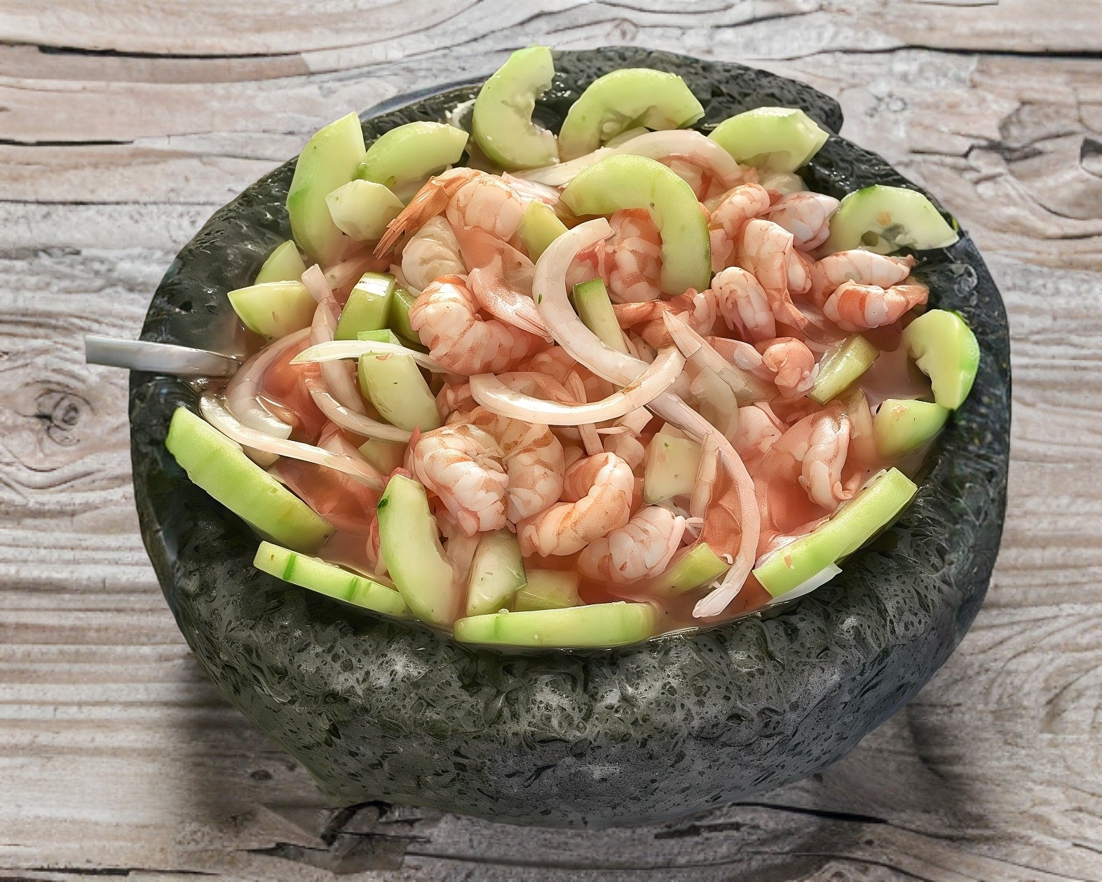 Camarones en mariposa marinados, acompañados con pepino, cebolla morada tomate, bañados en salsa de aguachile roja con aguacate