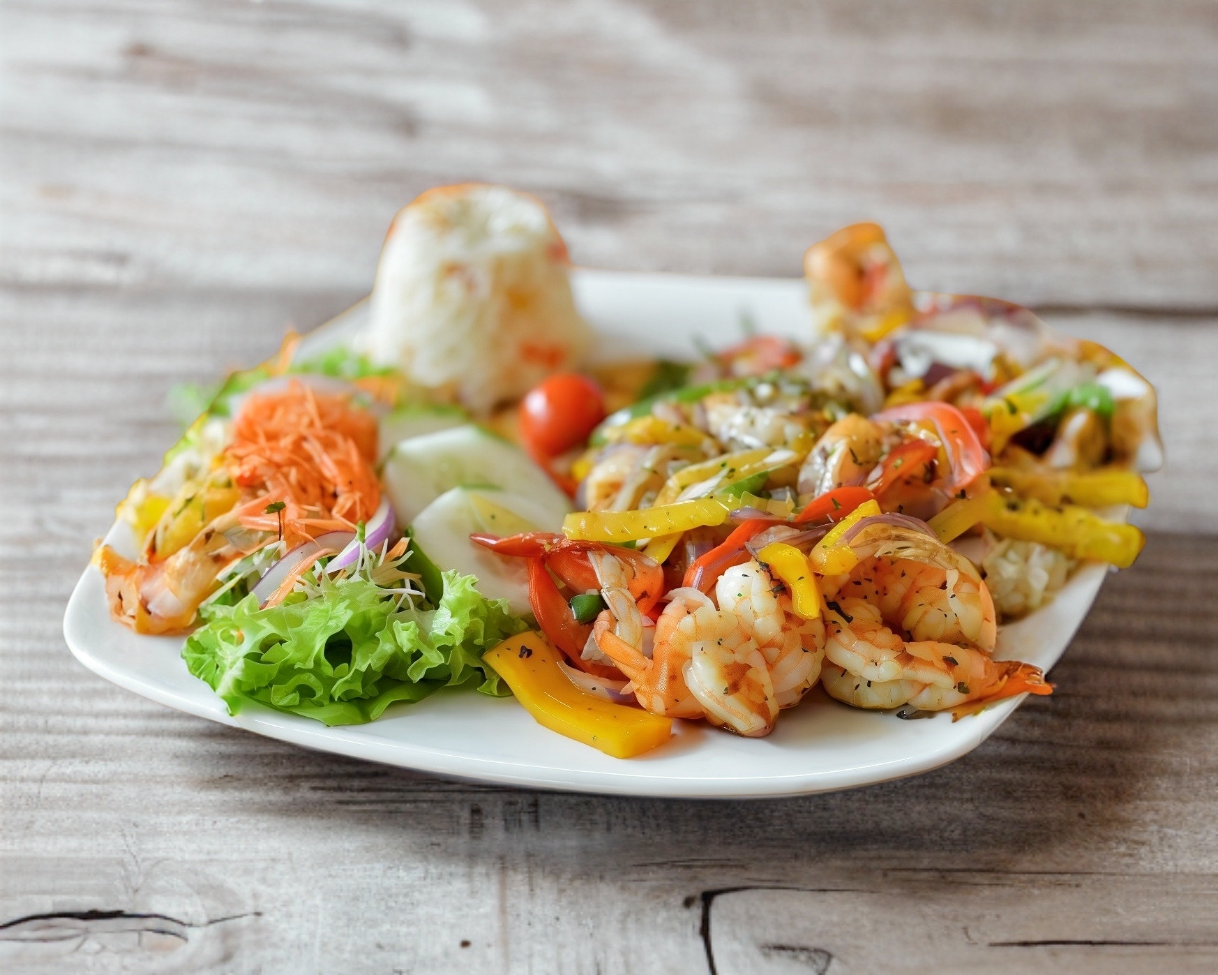 6 Camarones freídos en aceite de oliva con pico de gallo, clamato y morrón, con un toque de tequila. Acompañados de arroz, ensalada, y pan con mantequilla.