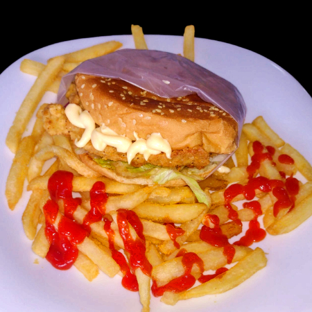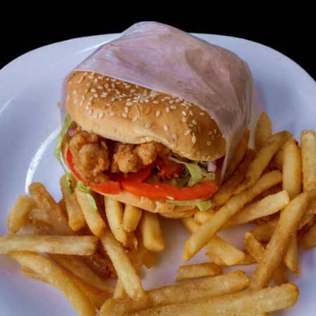 Hamburguesa de crujiente pechuga de pollo empanizada, sobre una cama de lechuga, tomate y cebolla morada, aderezo de mayonesa y papas a la francesa.