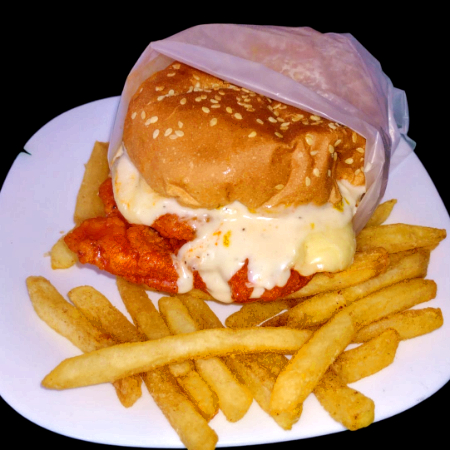 Hamburguesa de crujiente pechuga de pollo empanizada bañada en salsa de alitas, con queso gratinado, sobre una cama de lechuga, tomate y cebolla morada, aderezo ranch y papas a la francesa.