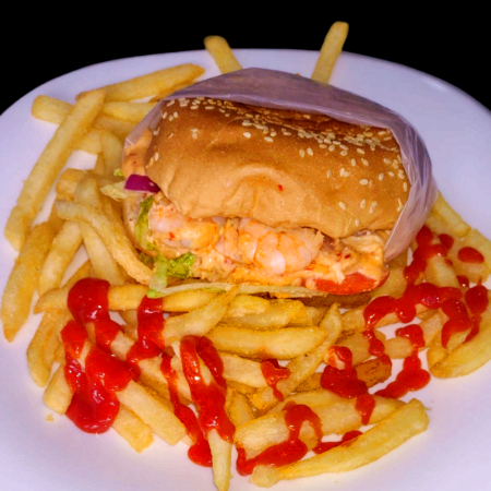 Hamburguesa de Camarón Gratinado con Salsa Diabla