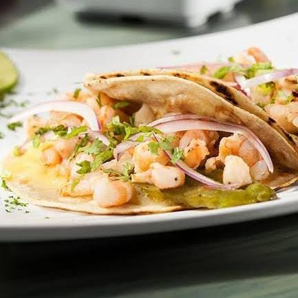 1 taco de mezcla de camarón, tocino, pico de gallo, chilaca y queso gratinado con cebolla morada, cilantro mas ensalada y salsa.