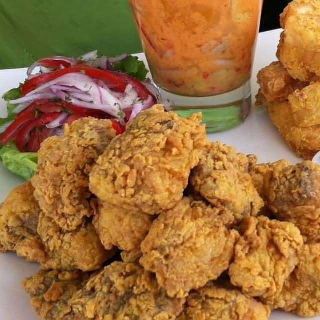 250 Gramos de chicharrón de pescado acompañado con media orden de guacamole, salsa y tortillas.