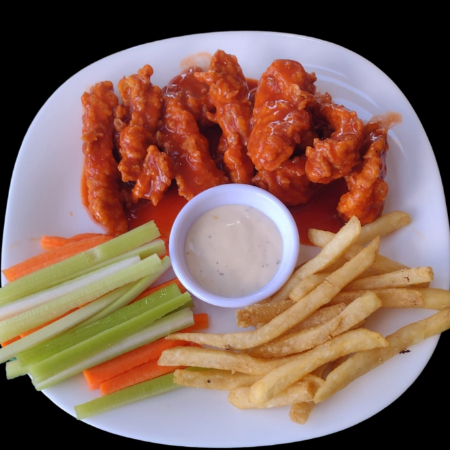 Tiras de pollo bañadas en salsa de alitas con papas a la francesa, apio, zanahoria y aderezo ranch
