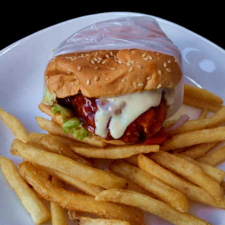 Hamburguesa de crujiente pechuga de pollo empanizada bañada en salsa BBQ, sobre una cama de lechuga, tomate y cebolla morada, aderezo ranch y papas a la francesa.