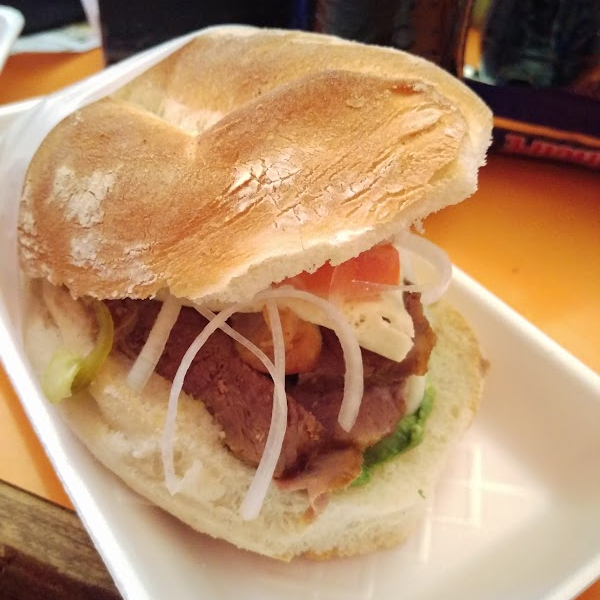 Carne, cebolla, tomate, repollo, chiles curtidos, mostaza y mayonesa.