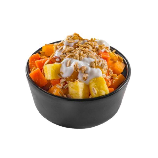 Fruta de temporada con yogurt natural y granola.