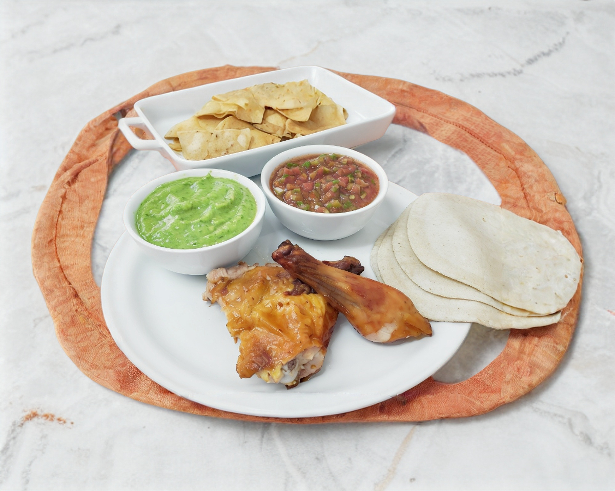 Incluye 1 pierna y 1 muslo, salsa, totopos y tortillas.