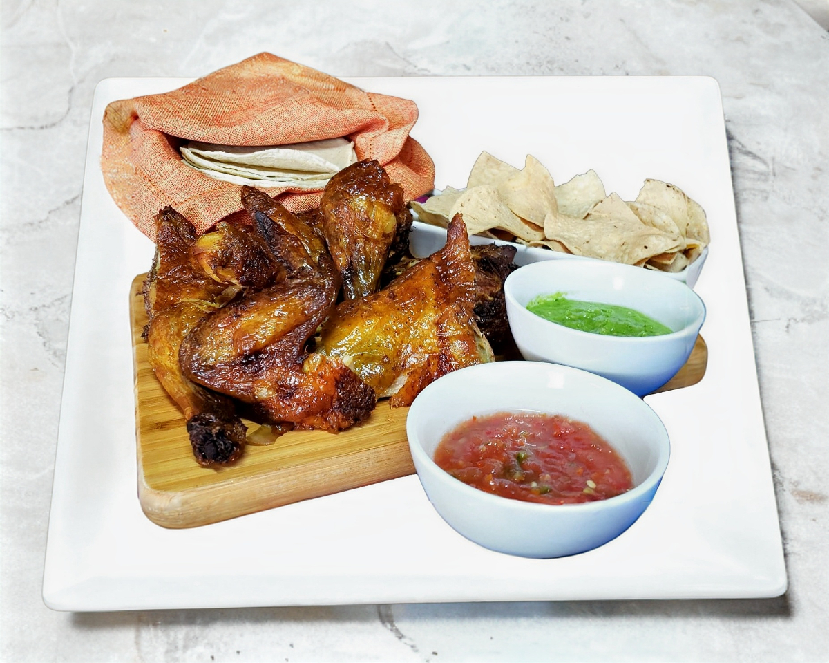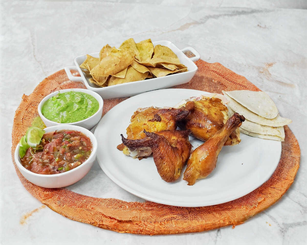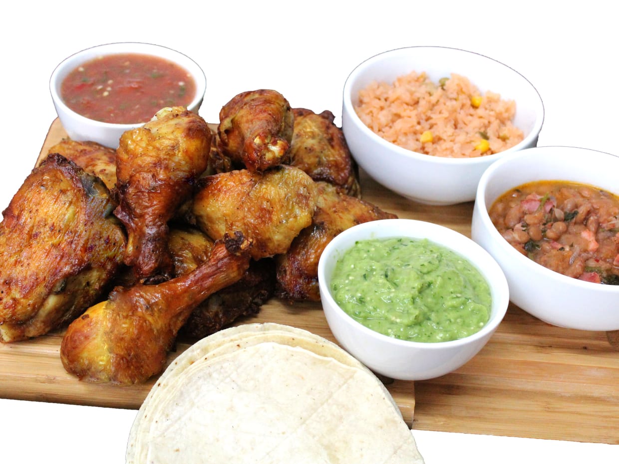Incluye 2 piernas y 2 muslos, totopos, salsa , tortillas.