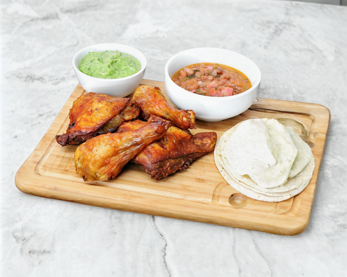 Incluye 5 piernas y 5 muslos, totopos, salsas y tortillas.