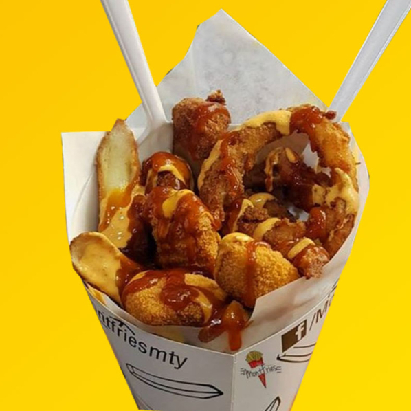 canastilla de papas a la francesa preparadas en 3 aderezos y 2 proteinas a elegir