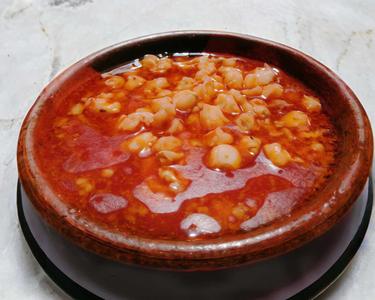 Plato de maíz y pancita, acompañado de pan francés o tortillas; incluye una porción de limón, cebolla, orégano y chile de árbol.
