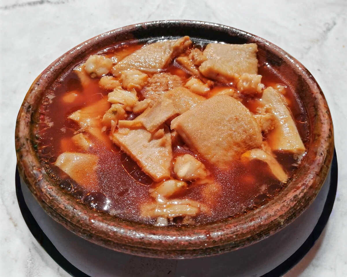 Plato de pancita sin maíz, acompañado de pan francés o tortillas; incluye una porción de limón, cebolla, orégano y chile de árbol.