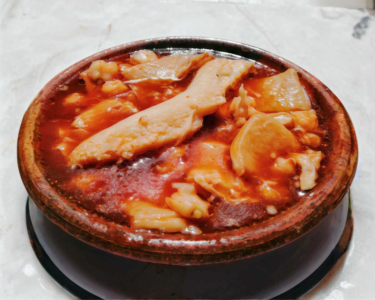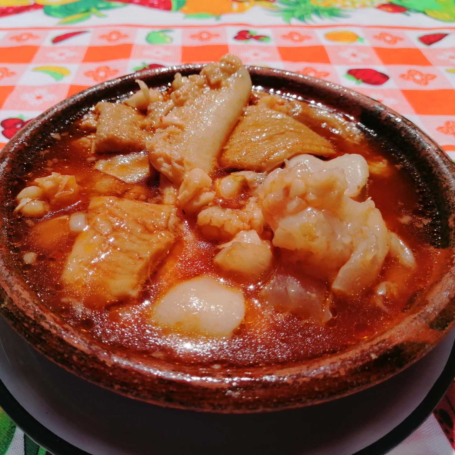 Plato de maíz, pancita, callo y pata, acompañado de pan francés o tortillas; incluye una porción de limón, cebolla, orégano y chile de árbol.