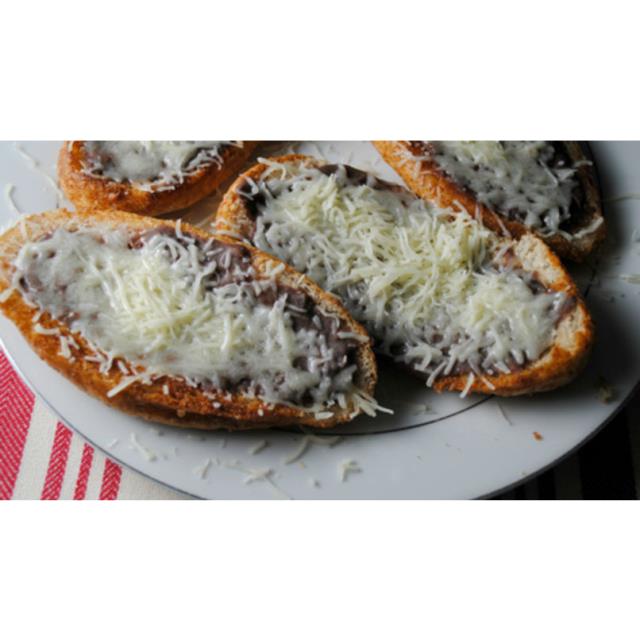 1/2 TAPA DE PAN FRANCES TOSTADO CON MANTEQUILLOS Y UNA CAMA DE FRIJOLES CON O SIN QUESO